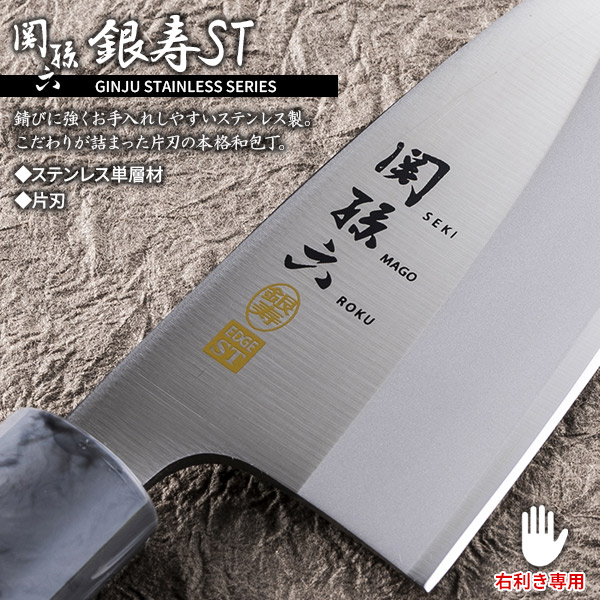 「関孫六 銀寿ST」包丁についてステンレス製で錆びに強い、片刃の本格包丁。