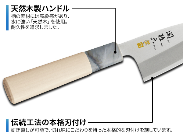 伝統工法の本格刃付けにより鋭い切れ味を持ちながらも、お手入れがしやすく、和包丁が初めての方にもお勧めのシリーズです。