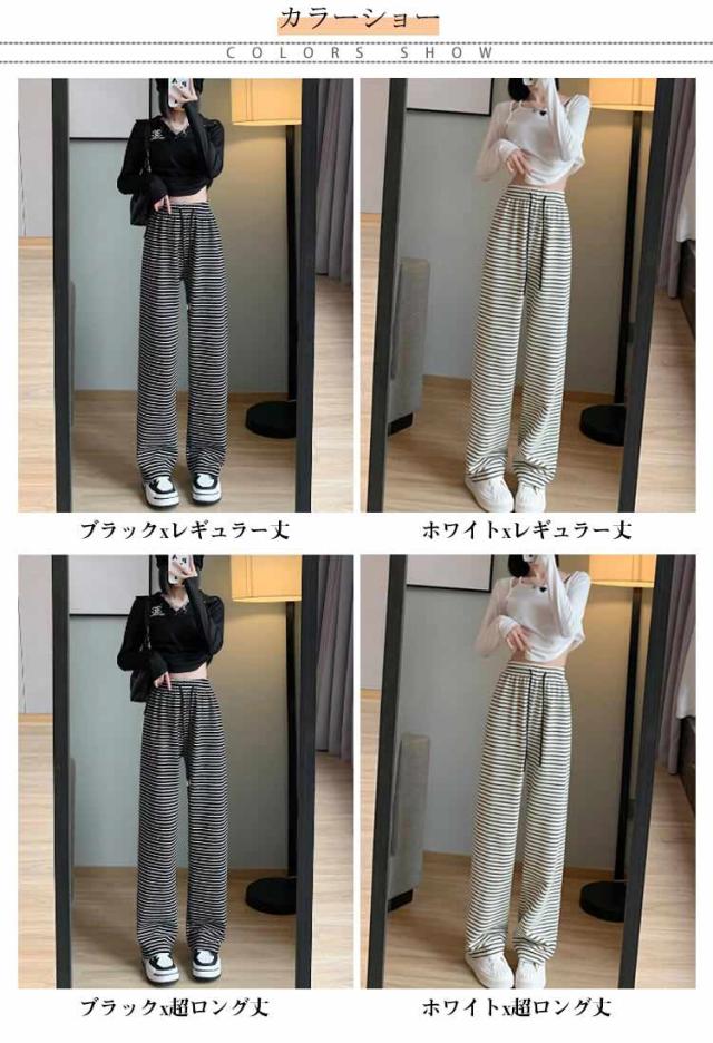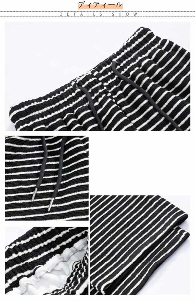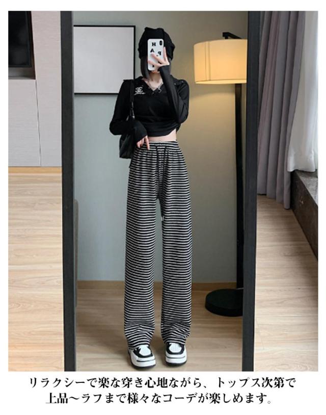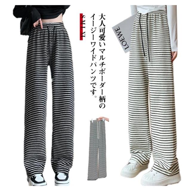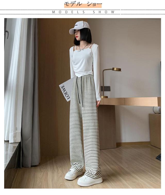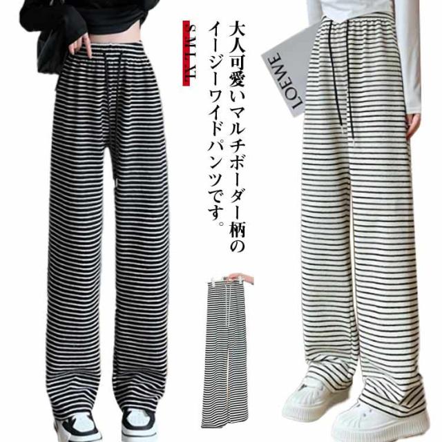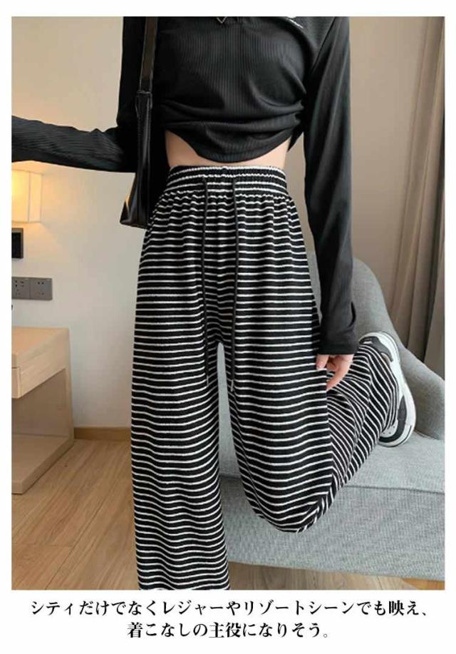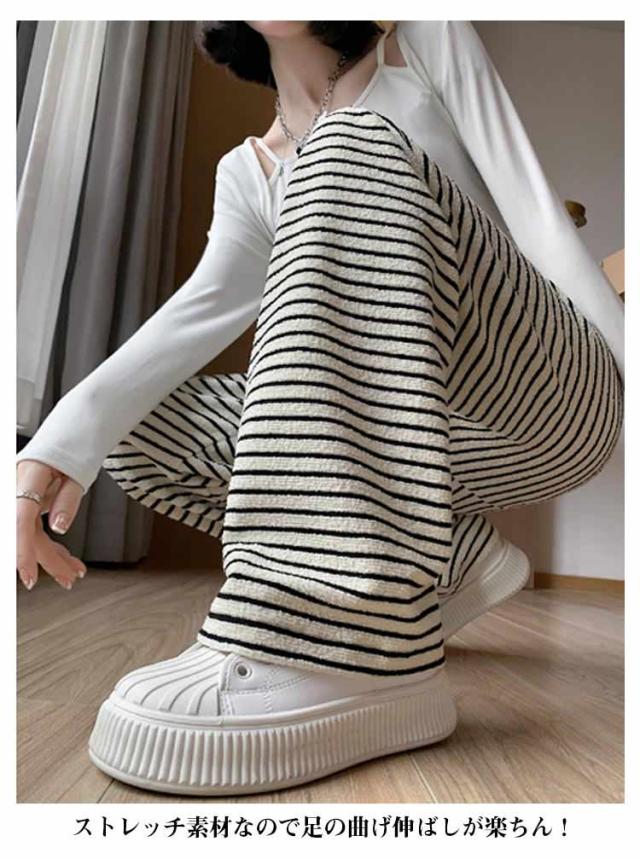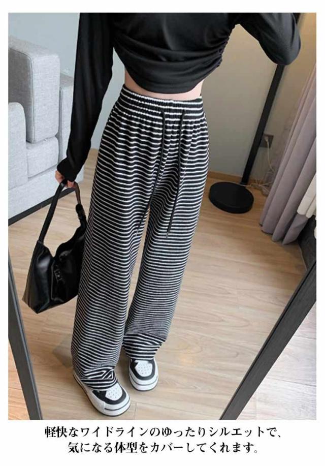 ストライプ柄 ストレート ボーダー柄 ウエストゴム ガウチョパンツ ワイド ストレートパンツ タックパンツ ワイドパンツ 美シルエット ゆったり カジュアル きれいめ 薄手 着痩せ ゆる 可愛い 森ガール 体型カバー