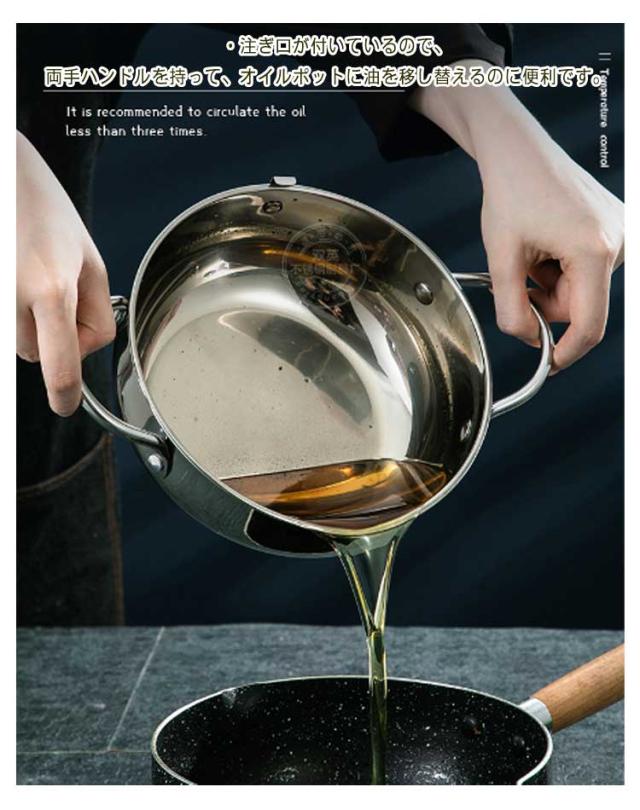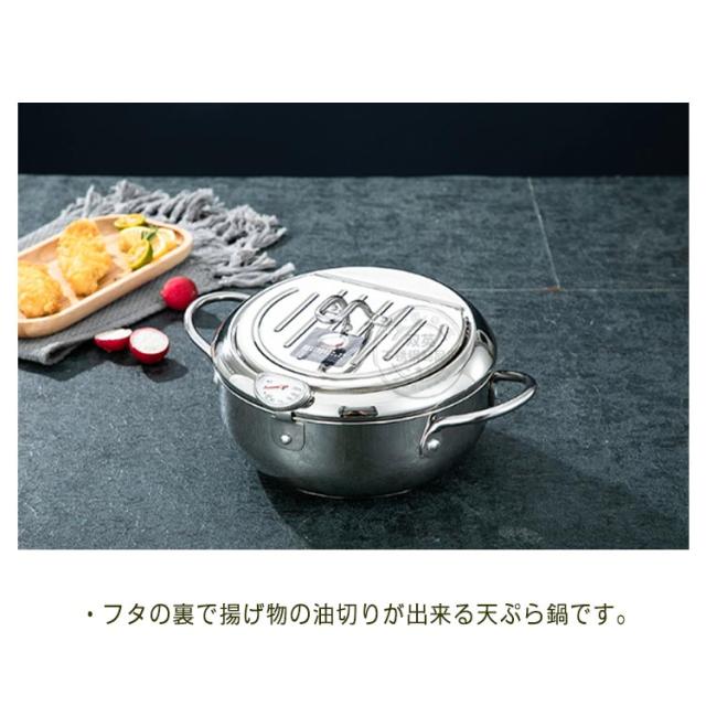 | ・油切り皿いらずでカラッと揚がる! ・油ハネが少ない深型設計、温度計付のステンレス製天ぷら鍋 ・フタの裏で揚げ物の油切りが出来る天ぷら鍋です。 ・フタに揚げたてを置くことができ、余った油が鍋に流れるようになっていて無駄がありません。 ・フタの上に一時置きできるので、二度揚げもカンタン!流れ作業のように、手際よくできます。 ・揚げごろが一目で分かる、見やすい温度計付きです。 ・注ぎ口が付いているので、両手ハンドルを持って、オイルポットに油を移し替えるのに便利です。 ・直火・IHに対応しています。 | |