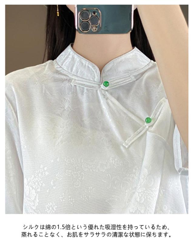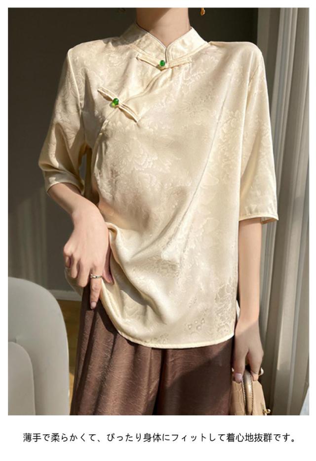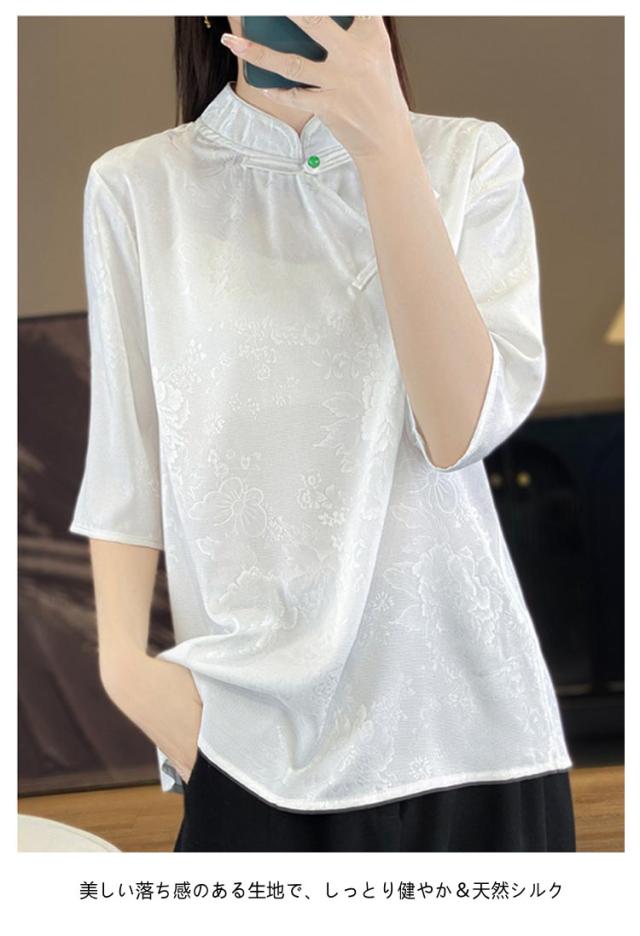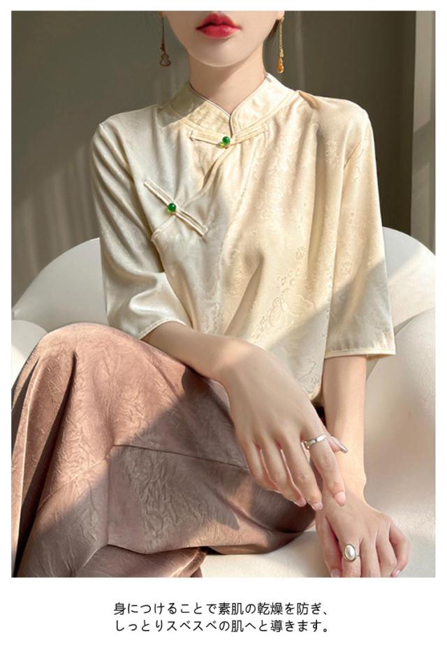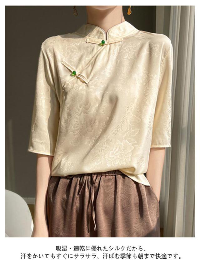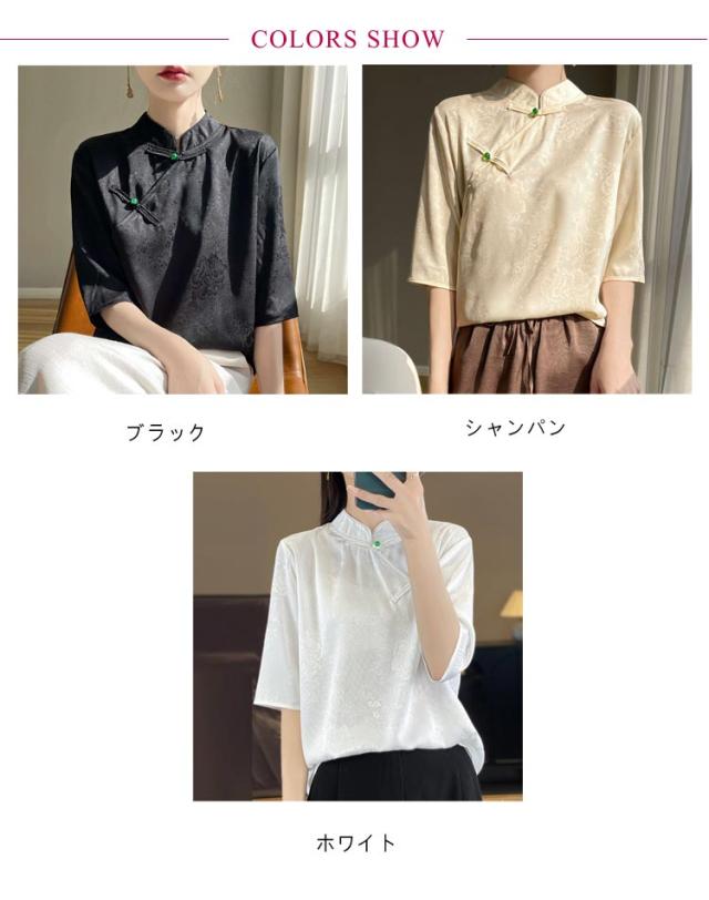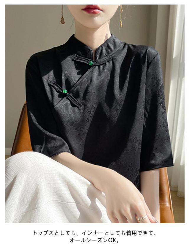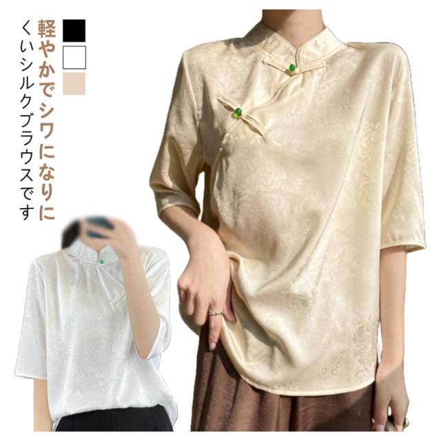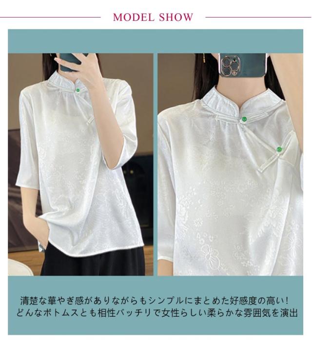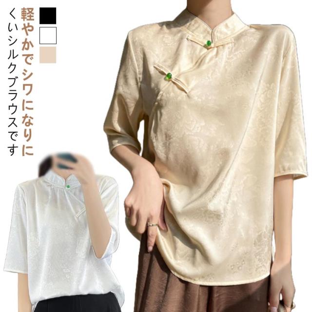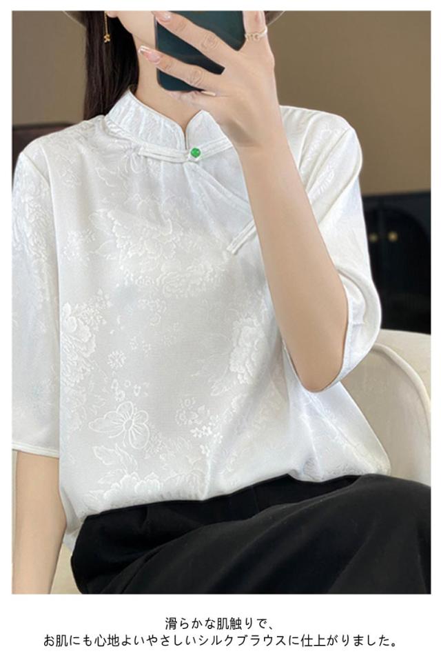 シャツ サテン ブラウス 半袖 プルオーバー レディース tシャツ 夏 スタンドカラー シルク 刺? チャイナボタン シルク 立ち襟 シャツブラウス トップス 体型カバー インナー 大きいサイズ 薄手 吸湿 通気性 光沢感