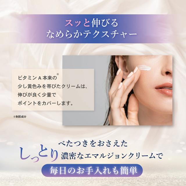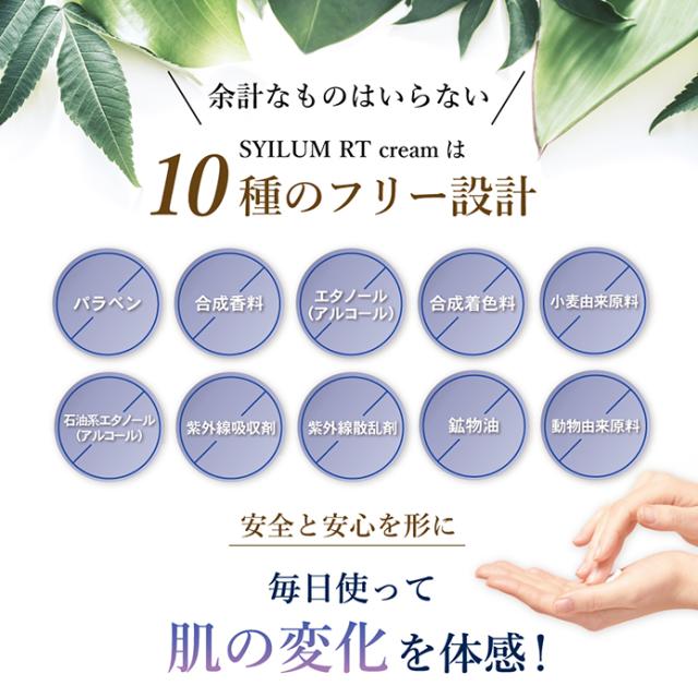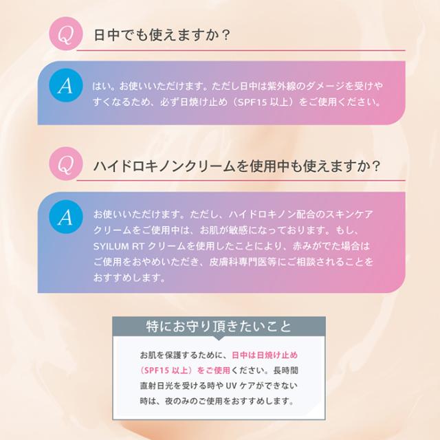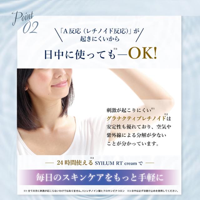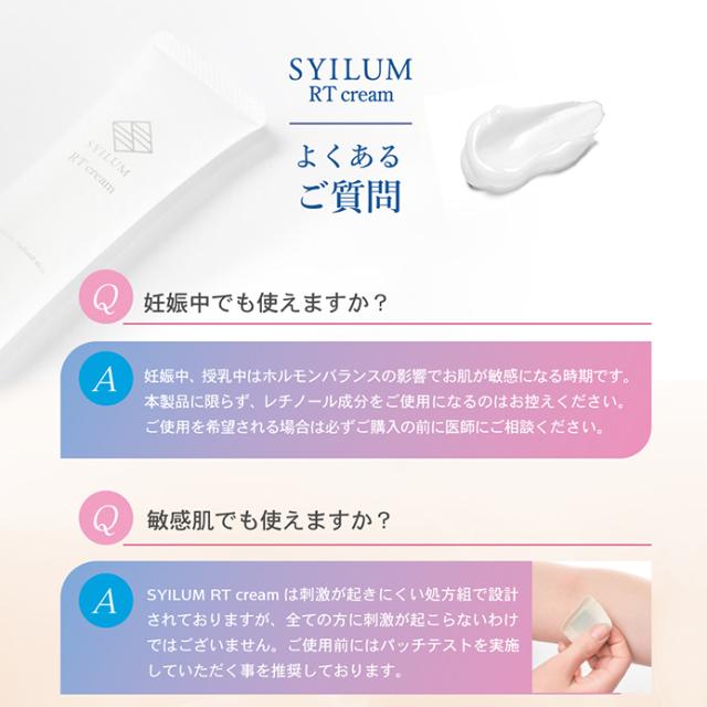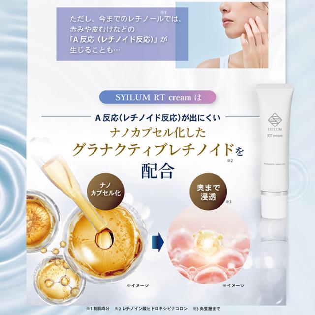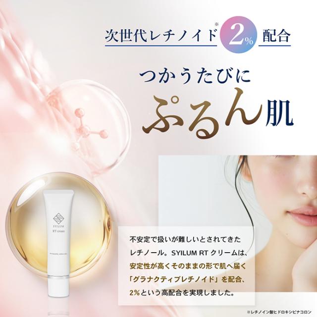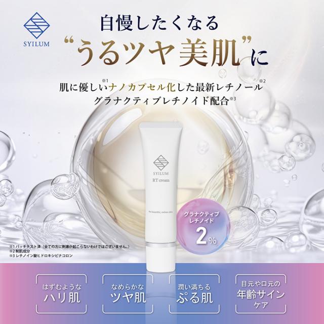 | 特徴 | 【次世代レチノイド※2%配合】 レチノールはビタミンAの一種で滑らかで柔軟性のある肌に導くと美容業界でも注目の成分です。しかし、とてもデリケートで扱いが難しく今までのレチノールでは、赤みや皮むけなどの「A反応(レチノイド反応)」が生じることも…。そこでSYILUM RTクリームは、A反応が出にくくなるようナノカプセル化した「グラナクティブレチノイド」のみを2%も配合。そのままの形でお肌へ届きます。※レチノイン酸ヒドロキシピナコロン 【エイジングケア成分を贅沢に3種配合】 ハリケアとして話題のマトリキシル3000、肌のバランスを整えるナイアシンアミド、みずみずしい肌へ導くフラーレンを贅沢に配合。自慢したくなるうるツヤ美肌へ。 【10種のフリー設計】 パラベン、合成香料、エタノール、合成着色料、小麦由来原料、石油系エタノール、紫外線吸収剤、紫外線散乱剤、鉱物油、動物由来原料の添加物を使用せず、肌への優しさを追求しました。 |
