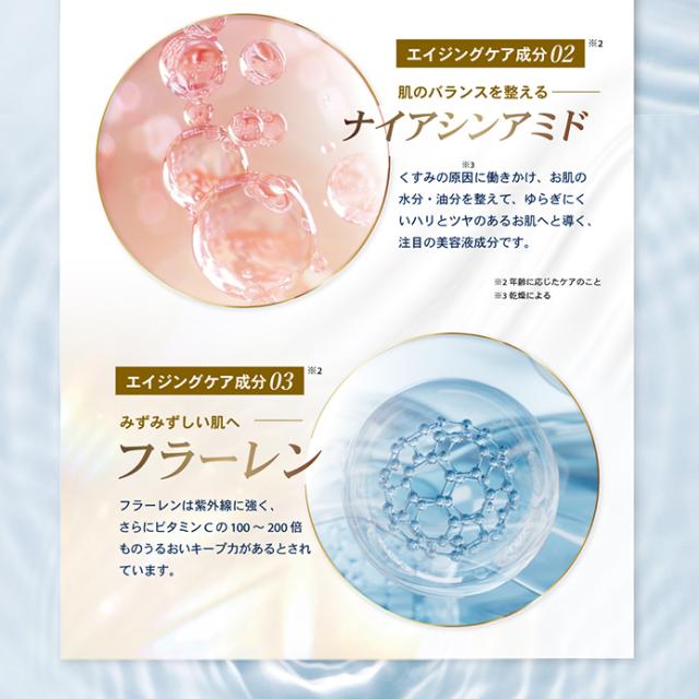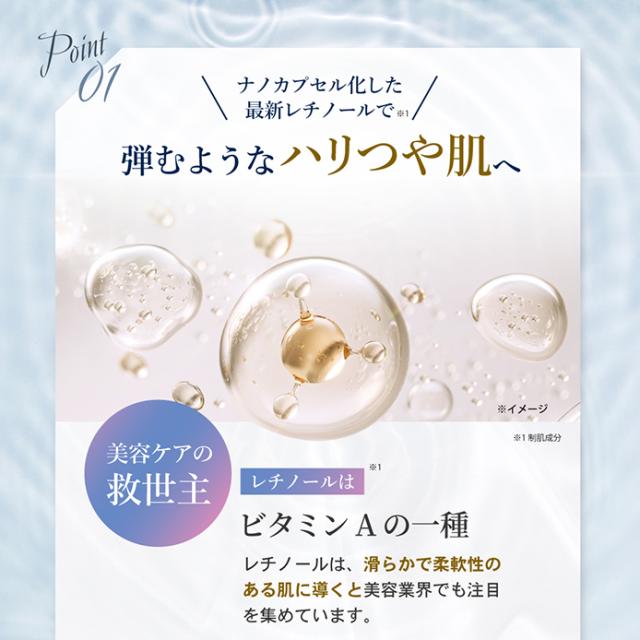 | 全成分 | 水、グリセリン、BG、スクワラン、トリエチルヘキサノイン、テトラエチルヘキサン酸ペンタエリスリチル、PPG-13デシルテトラデセス-24、セテアリルアルコール、ジメチルイソソルバイド、ステアリン酸PEG-25、ジメチコン、ステアリン酸ソルビタン、ペンチレングリコール、エチルヘキシルグリセリン、ナイアシンアミド、キハダ樹皮エキス、ポリクオタニウム-61、アデノシン三リン酸2Na、レチノイン酸ヒドロキシピナコロン、フラーレン、パルミトイルペンタペプチド-4、マカデミアナッツ脂肪酸フィトステリル、トリイソステアリン、キサンタンガム、PVP、カルボマー、(アクリレーツ/アクリル酸アルキル(C10-30))クロスポリマー、ポリソルベート20、水酸化K、酢酸トコフェロール、EDTA-2Na、フェノキシエタノール |