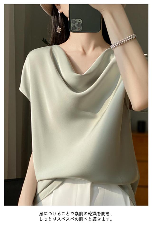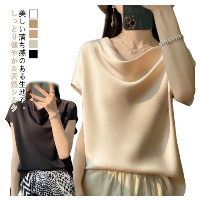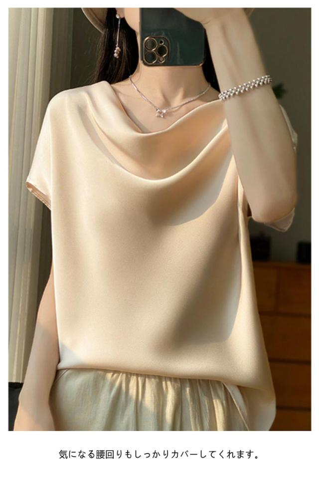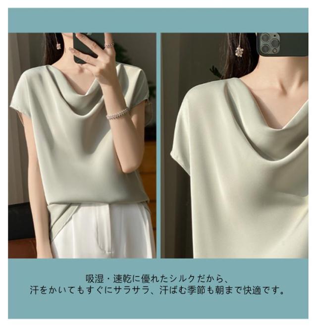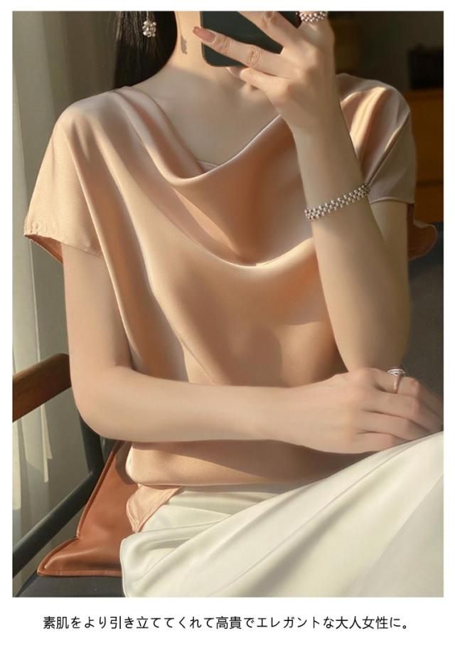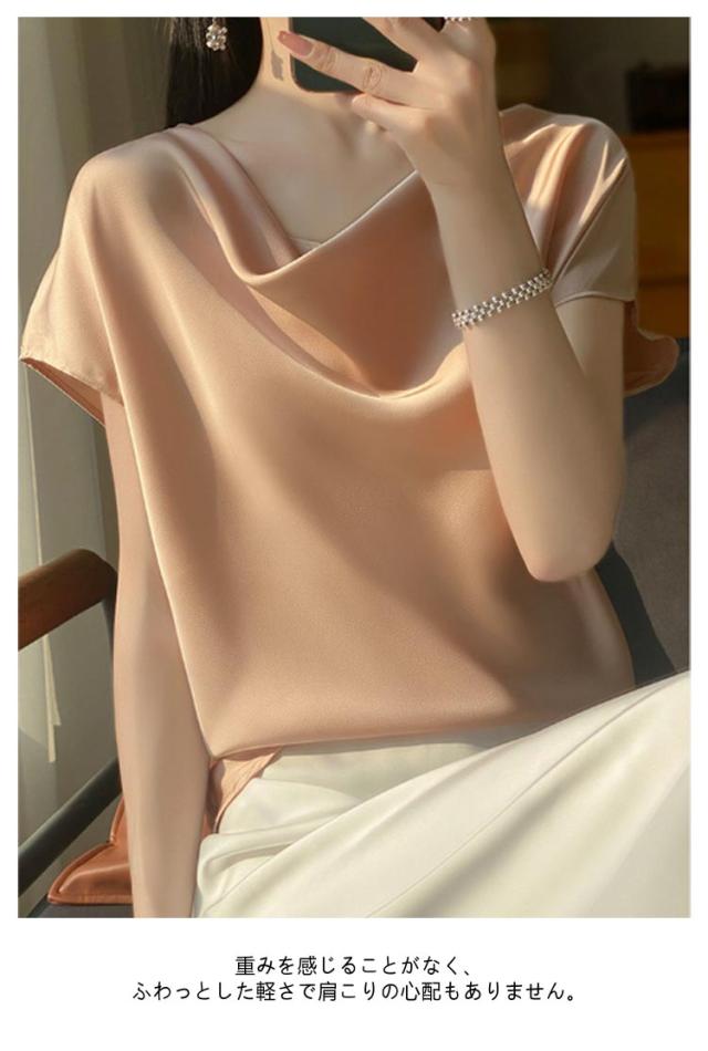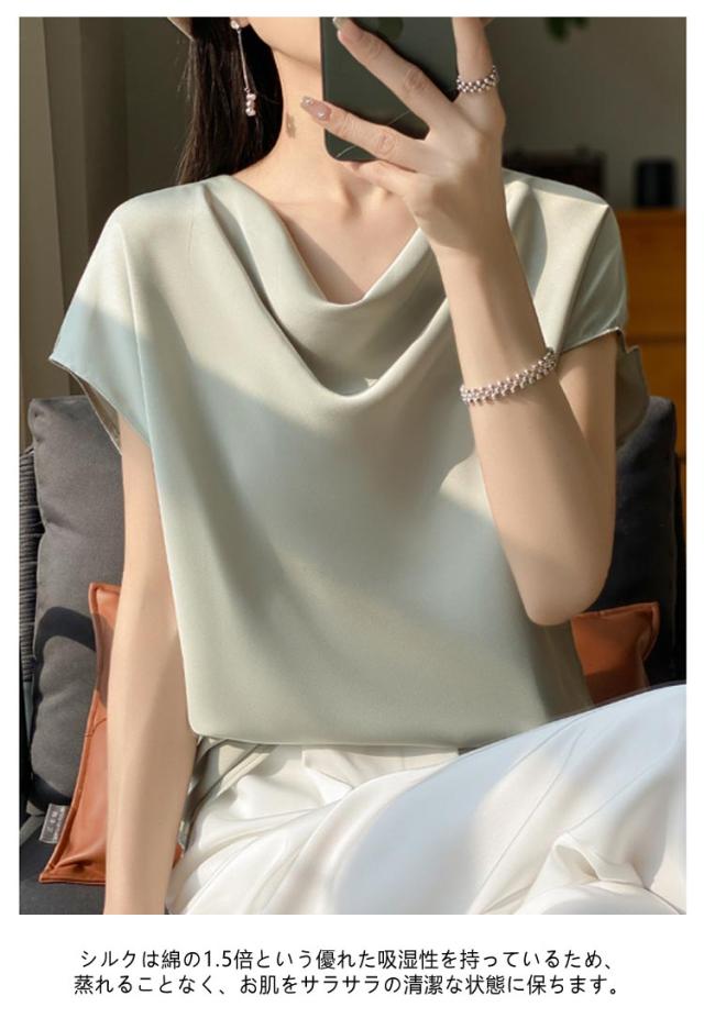 夏 Uネック サテン 半袖 レディース ブラウス tシャツ シルク プルオーバー 大きいサイズ 吸湿 フレンチスリーブ トップス 体型カバー インナー シャツブラウス 高品質 保温 シルク 肌に優しい 薄手 滑らか ひんやり 光沢感 透けない