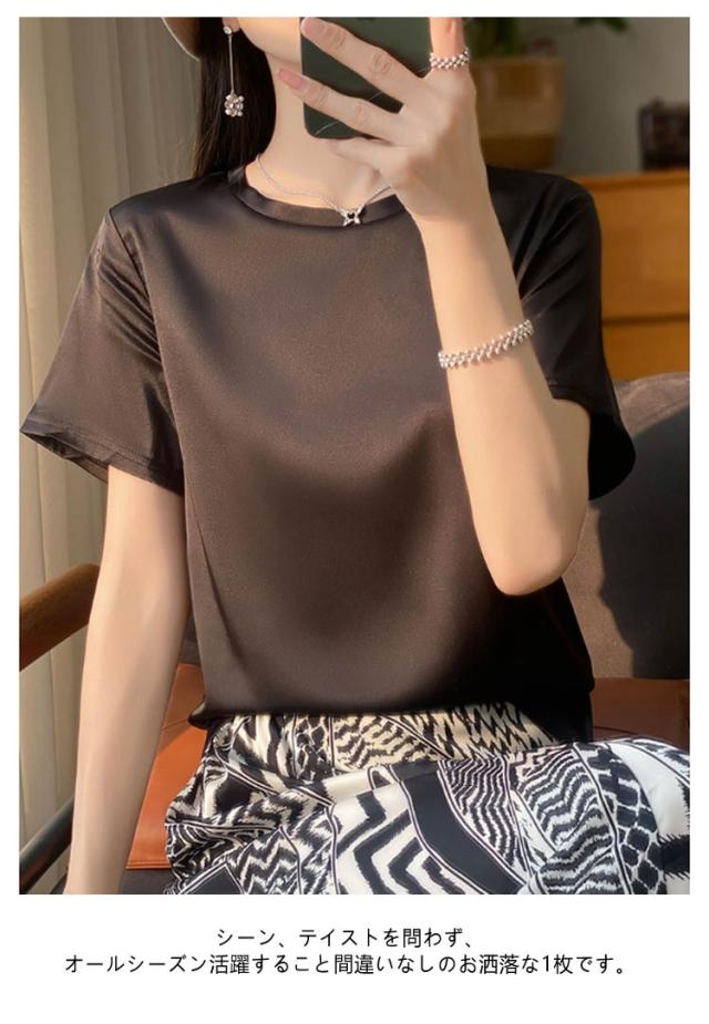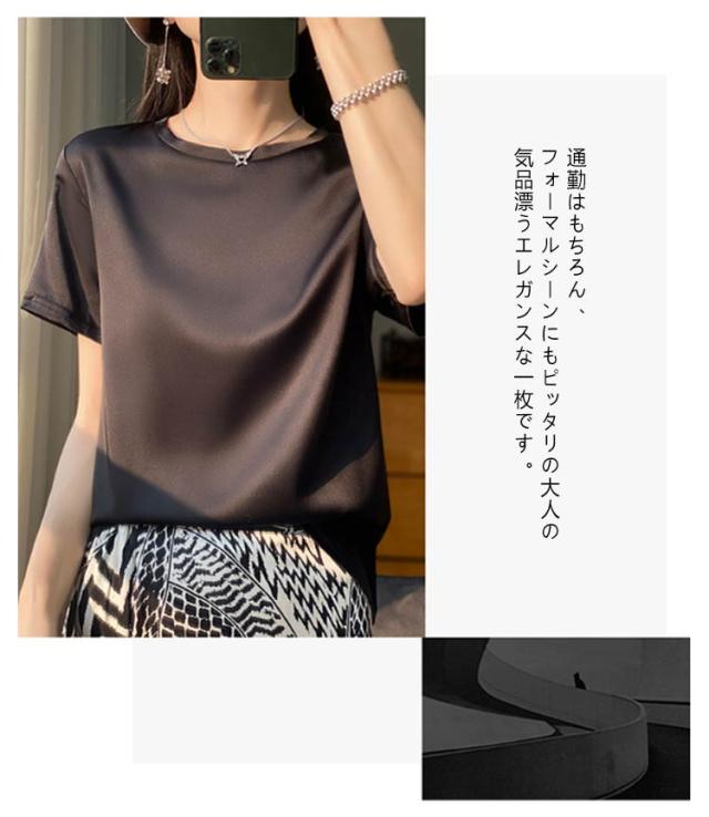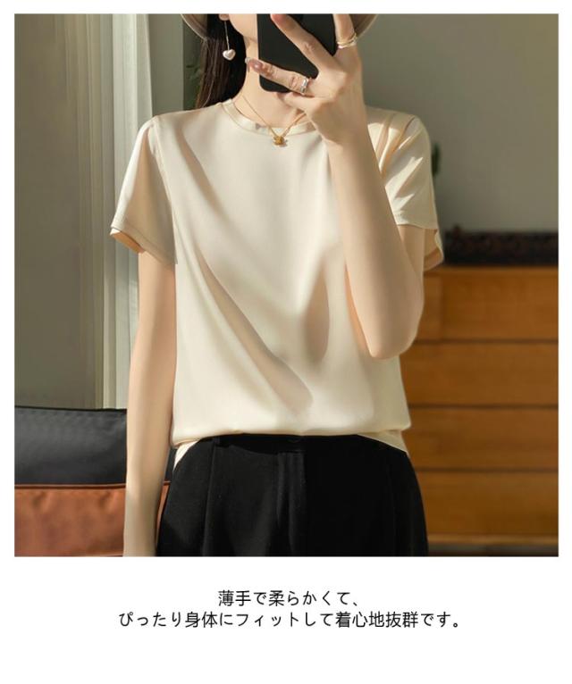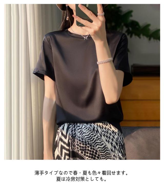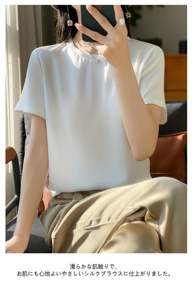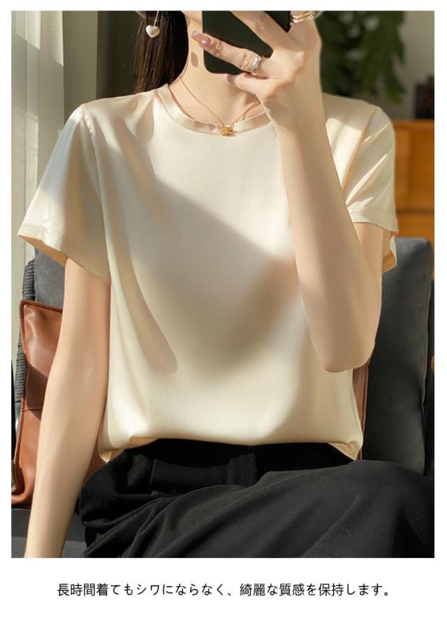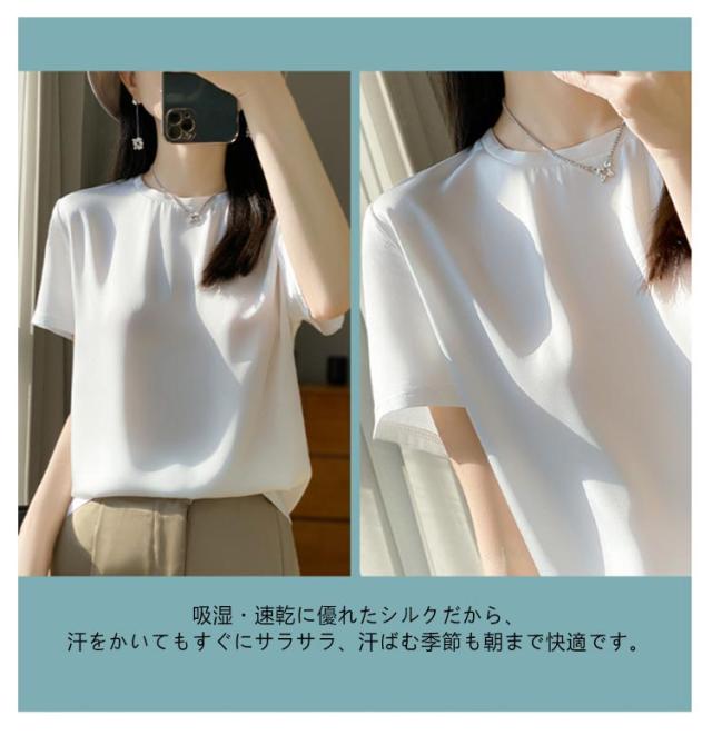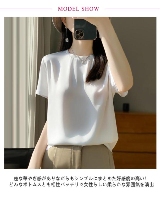 トップス プルオーバー ブラウス 半袖 シャツ サテン 光沢感 tシャツ 速乾 丸首 夏 シルク シャツ インナー 大きいサイズ 体型カバー 吸湿 薄手 敏感肌 シャツブラウス 透けない 肌着 大人 きれいめ 高品質 肌に優しい 上品 黒 白 ホワイト ブラック 無地