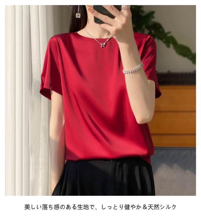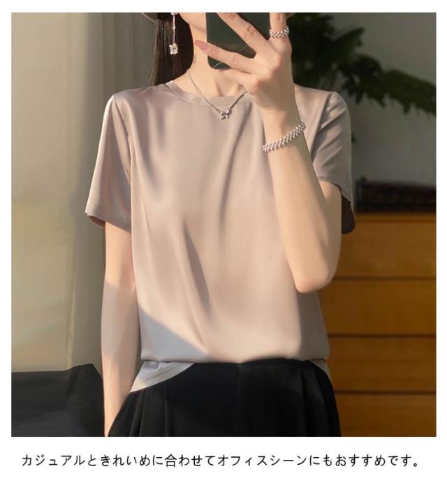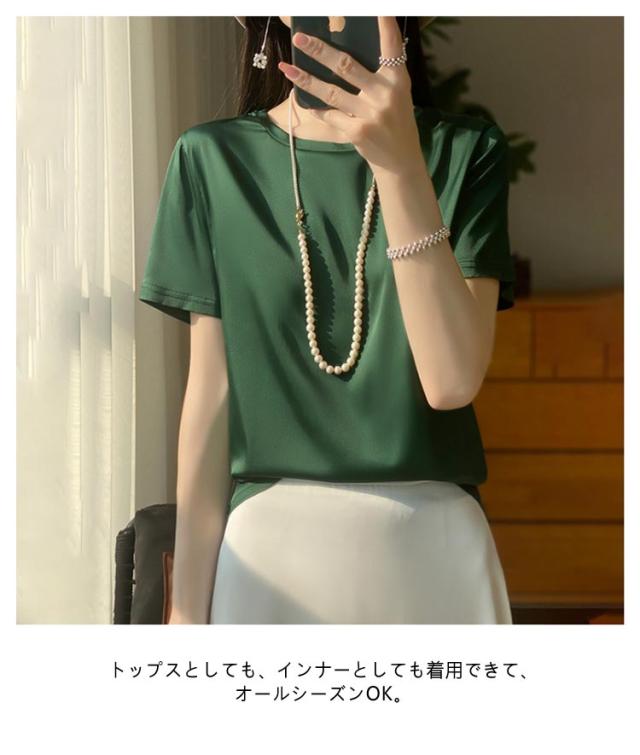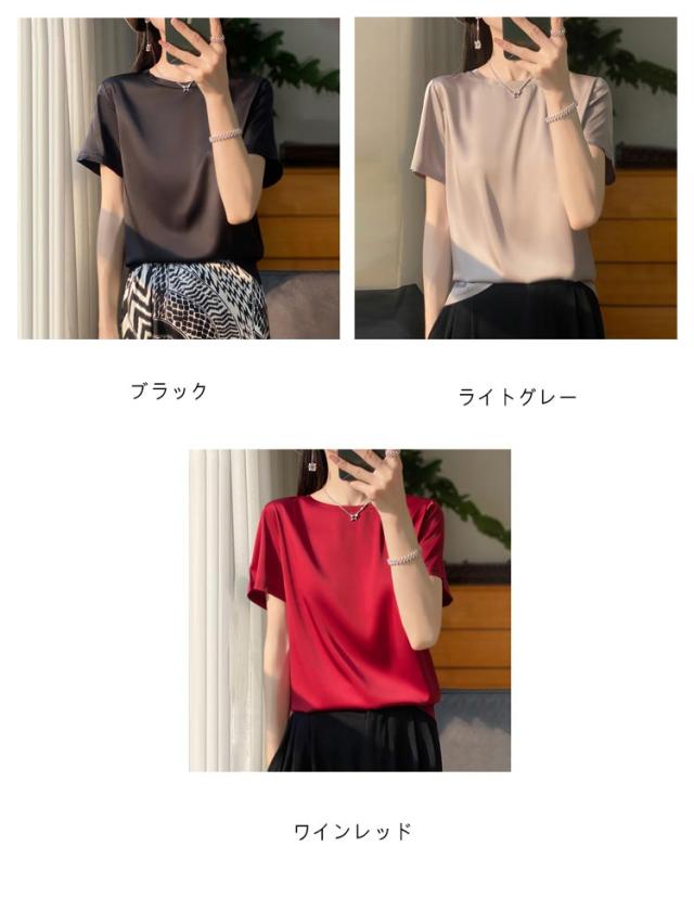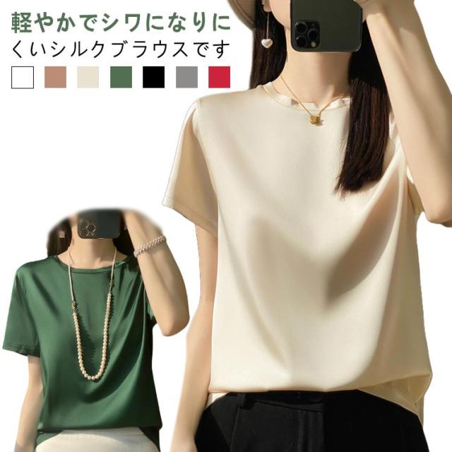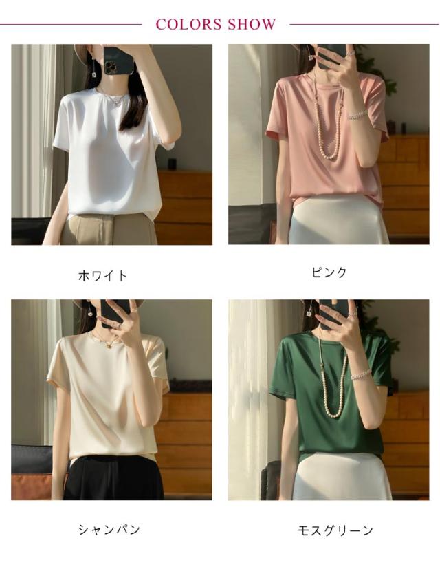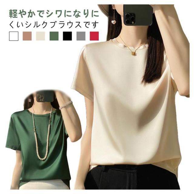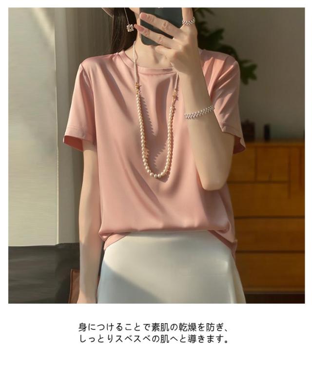 トップス プルオーバー ブラウス 半袖 シャツ サテン 光沢感 tシャツ 速乾 丸首 夏 シルク シャツ インナー 大きいサイズ 体型カバー 吸湿 薄手 敏感肌 シャツブラウス 透けない 肌着 大人 きれいめ 高品質 肌に優しい 上品 黒 白 ホワイト ブラック 無地
