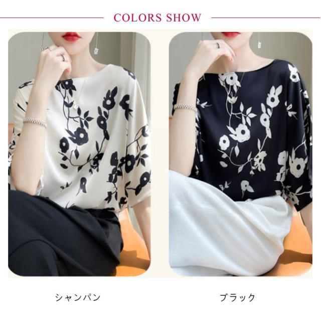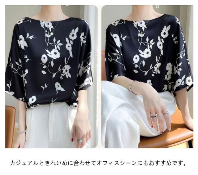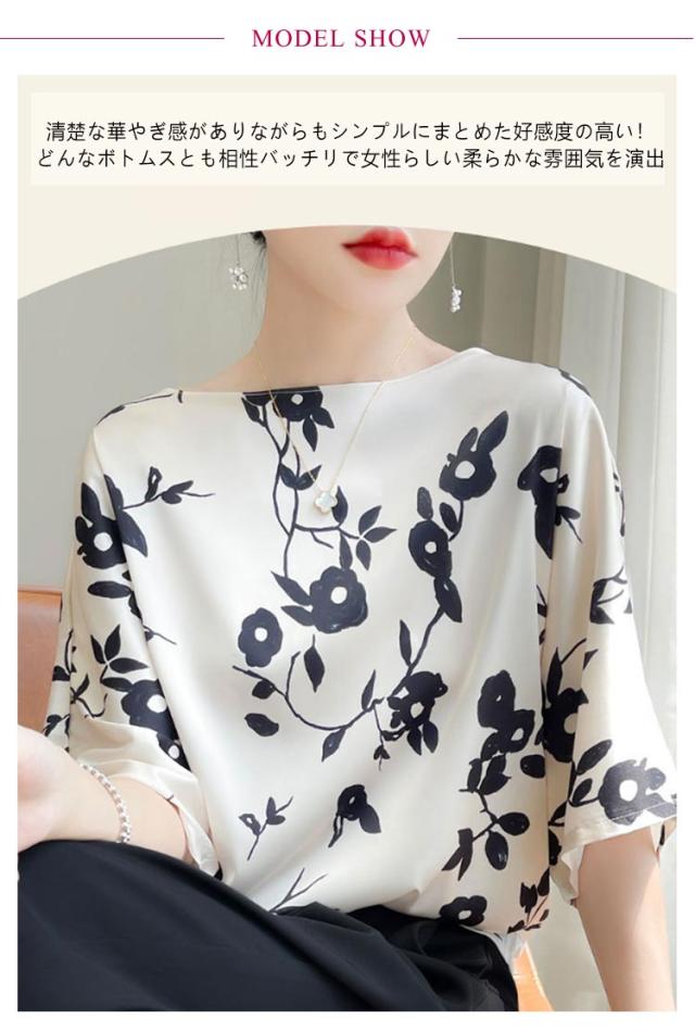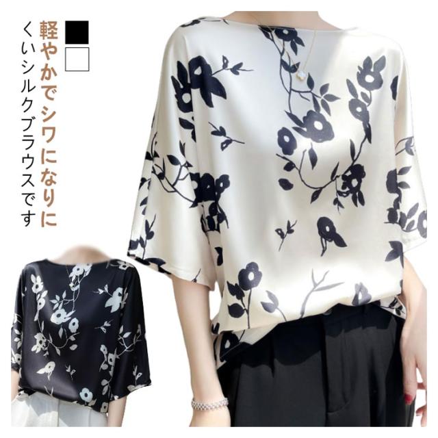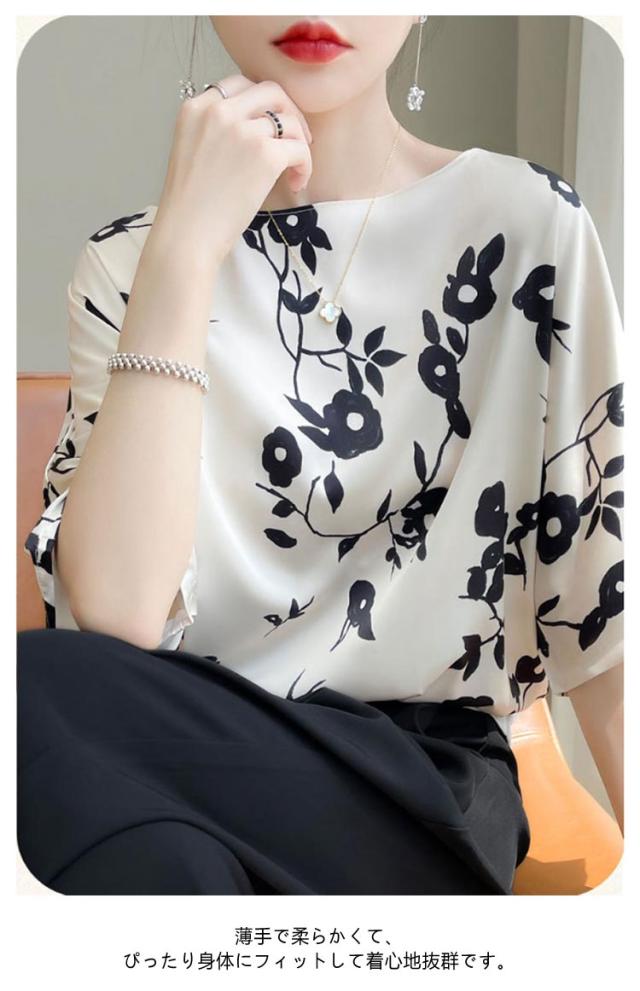 シルク 丸首 プルオーバー 半袖 トップス tシャツ シルク シャツブラウス レディース クルーネック ブラウス サテン プリント 体型カバー インナー 大きいサイズ シャツ 柄 花柄 薄手 光沢感 透けない 肌着