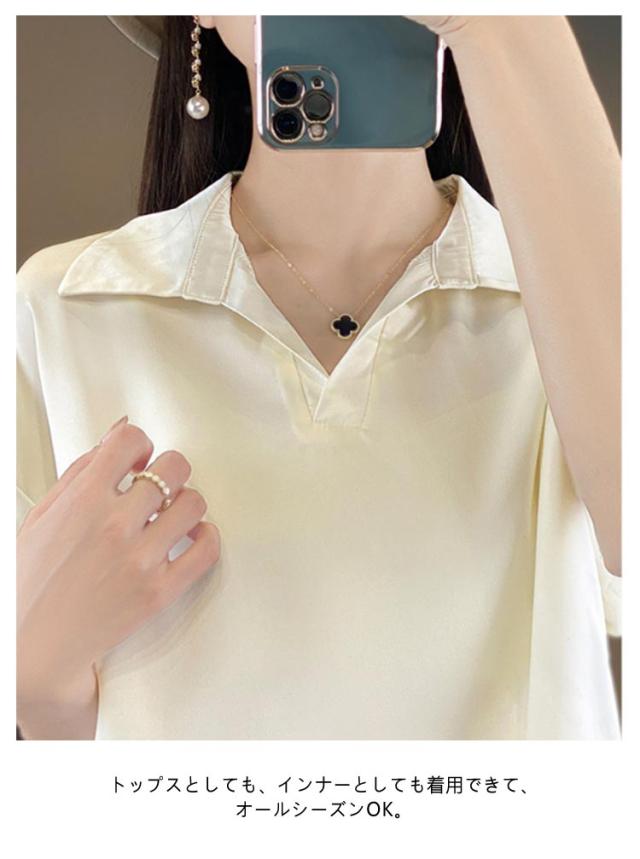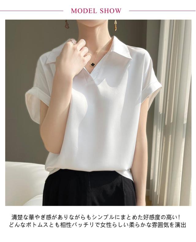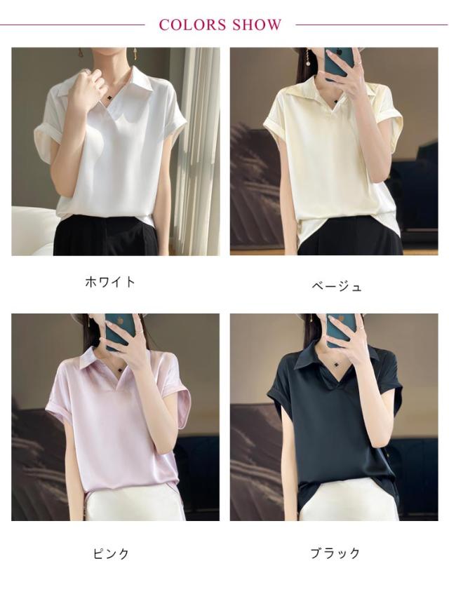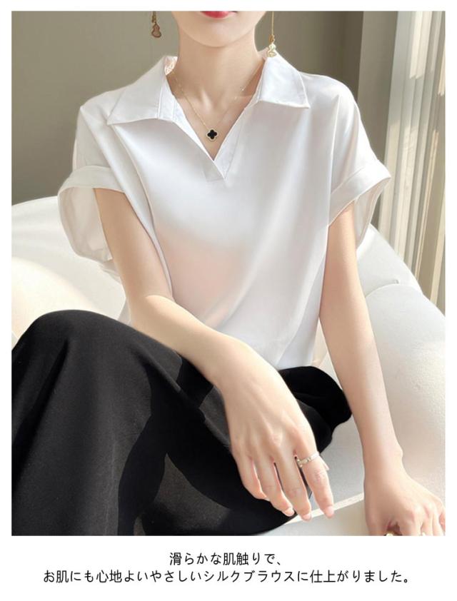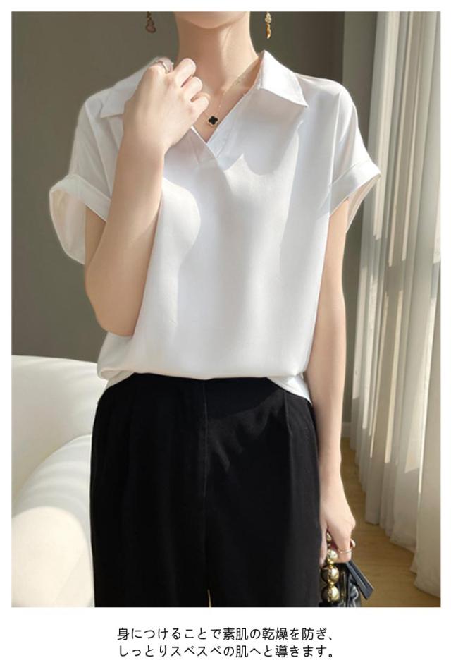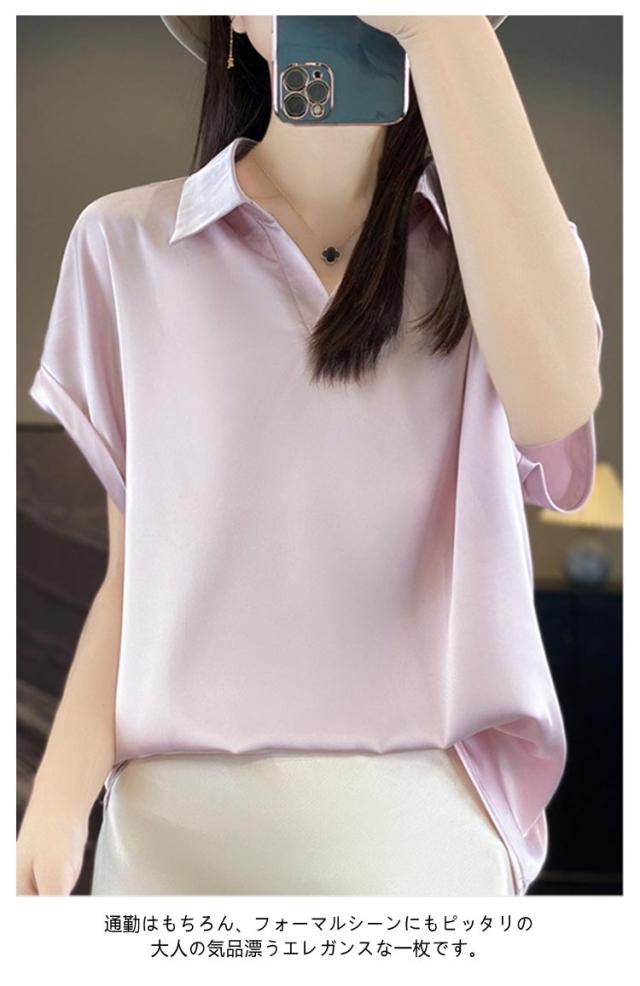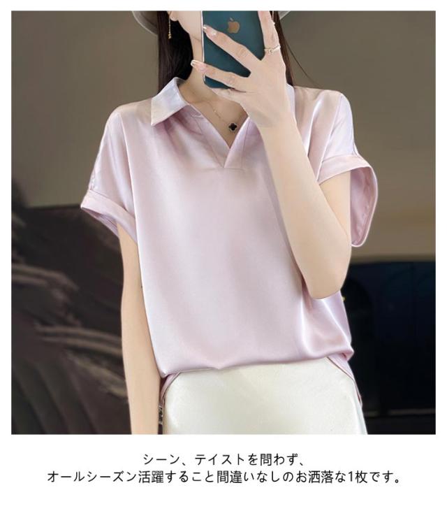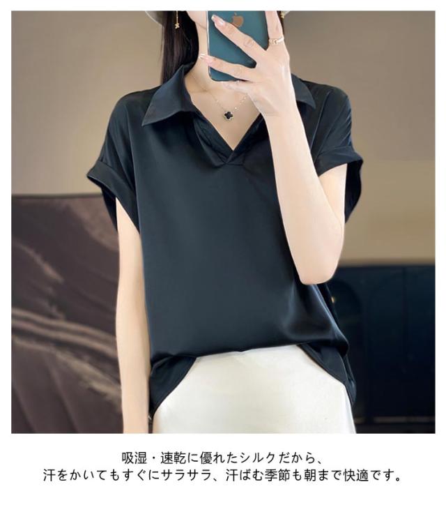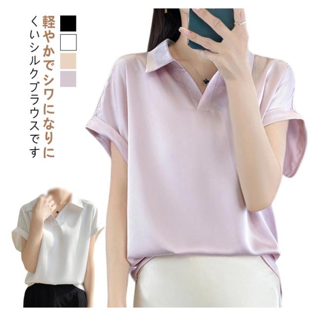 シルク 大きいサイズ ブラウス サテン プルオーバー 襟付き レディース 夏 半袖 tシャツ シャツ シャツブラウス インナー トップス 体型カバー シルク Vネック 柄 花柄 薄手 吸湿 通気性 敏感肌 光沢感 透けない 肌着