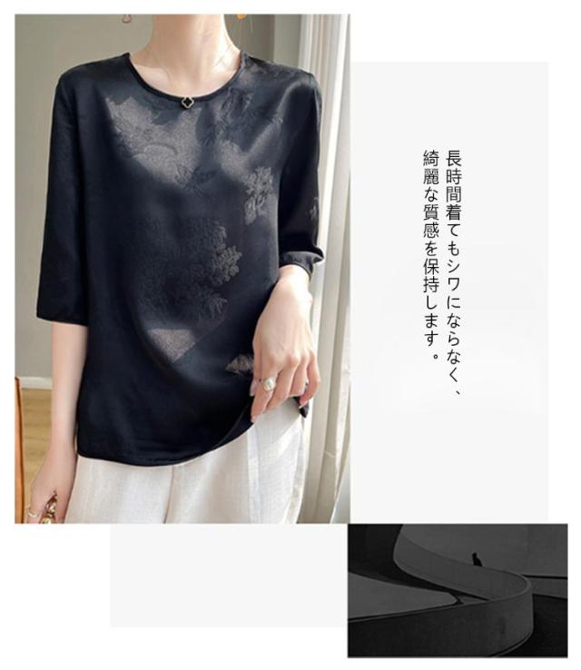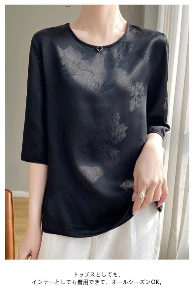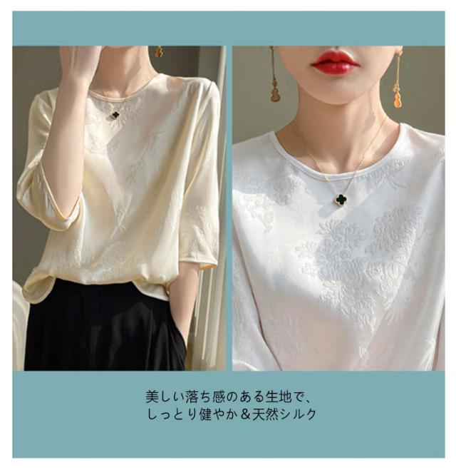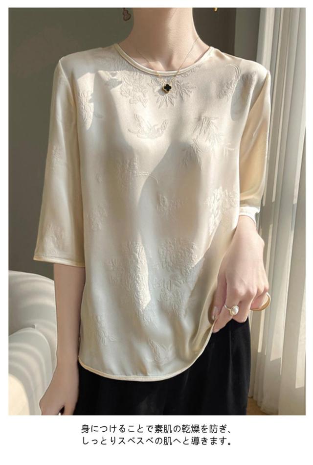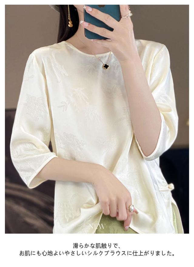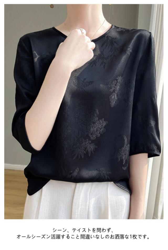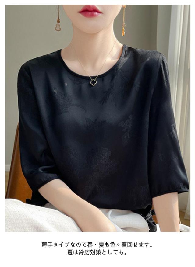 シルク tシャツ ブラウス 丸首 シャツブラウス シルク シャツ サテン プルオーバー チャイナボタン 刺? 夏 通気性 光沢感 トップス 体型カバー インナー 大きいサイズ 薄手 吸湿 半袖 レディース 透けない 肌着 大人 きれいめ
