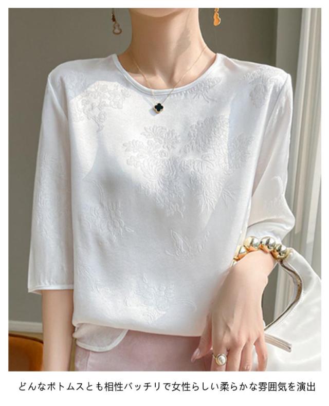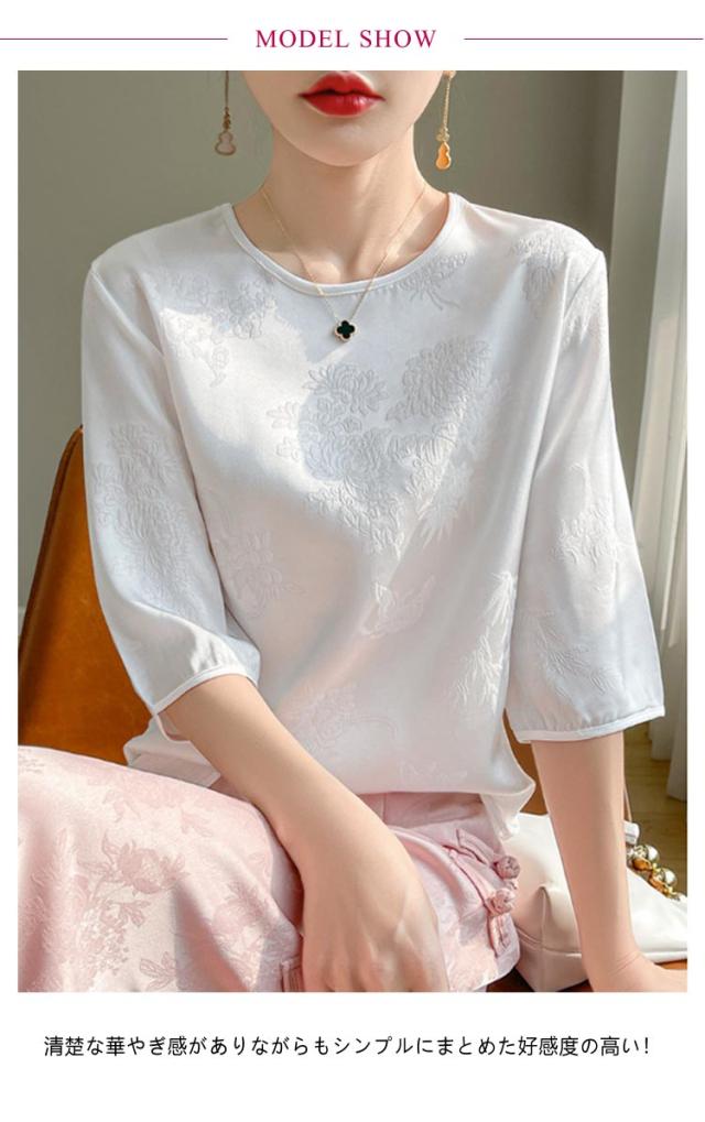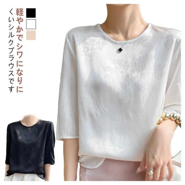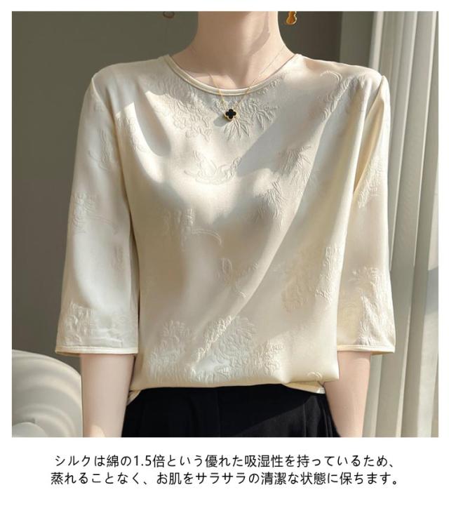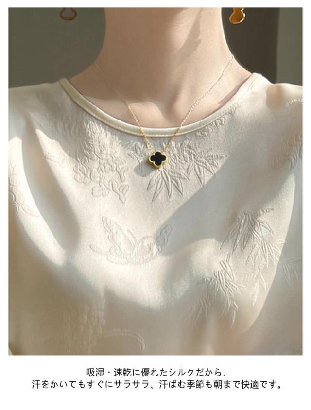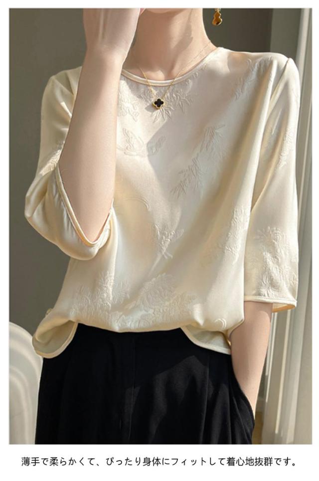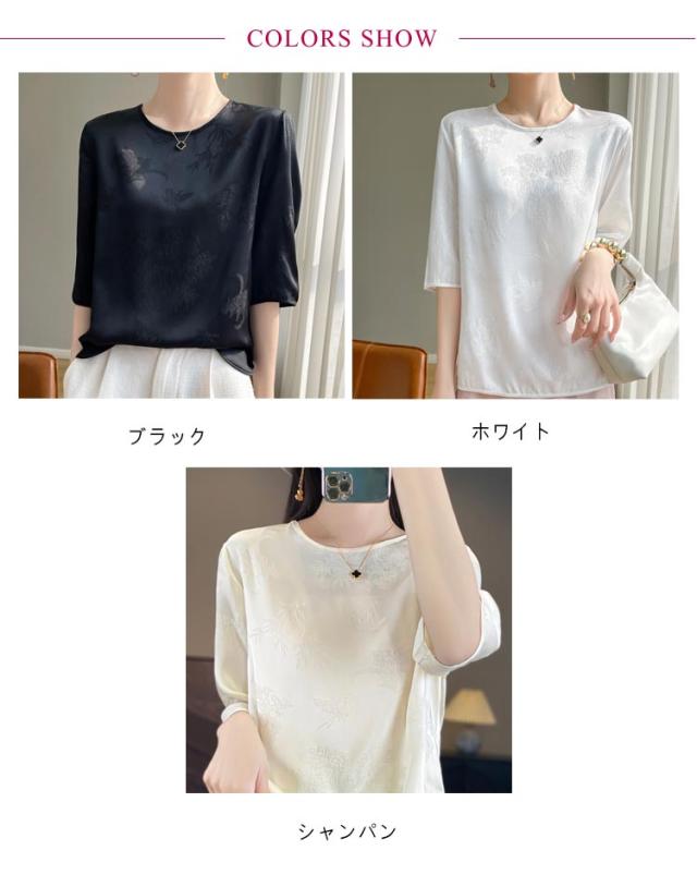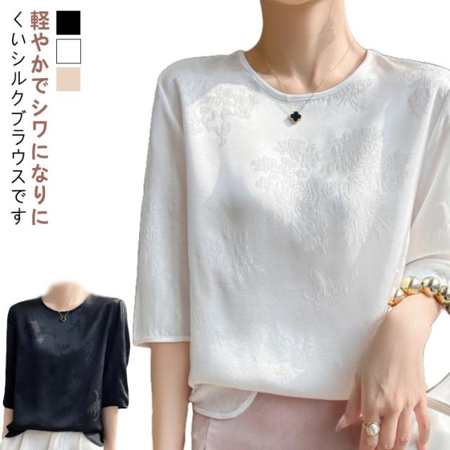 シルク tシャツ ブラウス 丸首 シャツブラウス シルク シャツ サテン プルオーバー チャイナボタン 刺? 夏 通気性 光沢感 トップス 体型カバー インナー 大きいサイズ 薄手 吸湿 半袖 レディース 透けない 肌着 大人 きれいめ