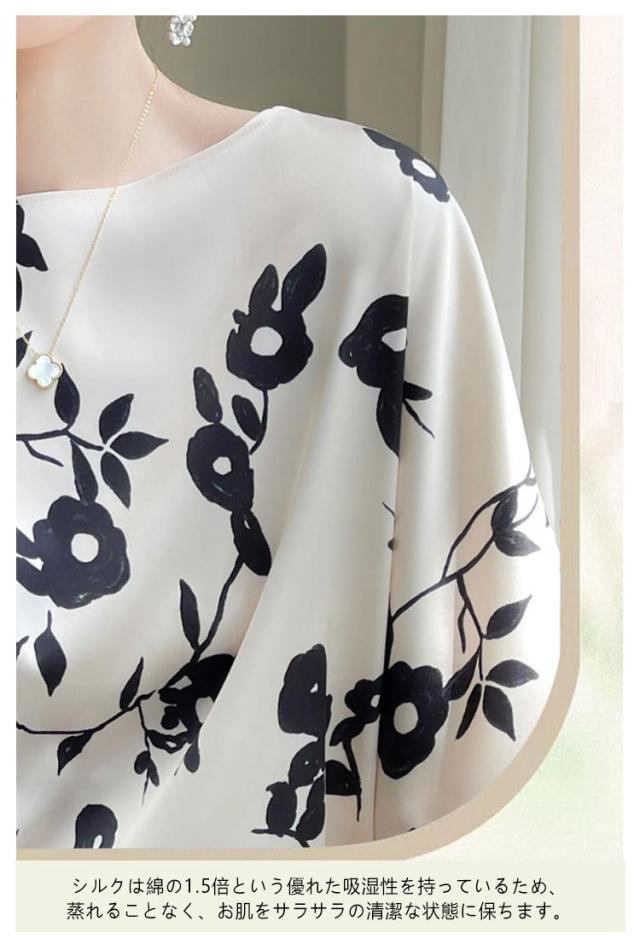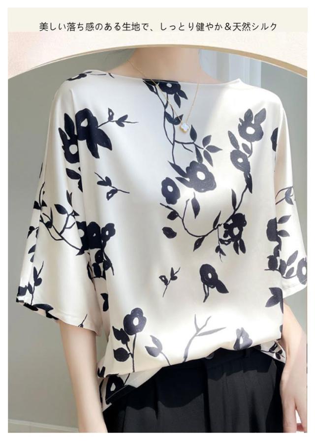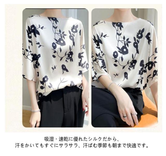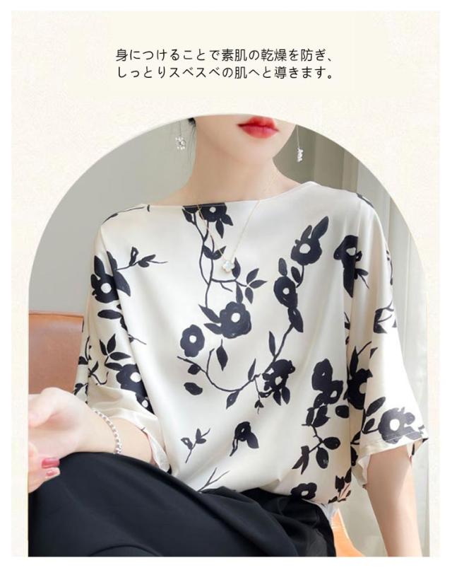 ブラウス tシャツ 半袖 プルオーバー シャツ 夏 クルーネック 体型カバー トップス サテン 丸首 シャツブラウス シルク シルク インナー 大きいサイズ プリント 柄 花柄 薄手 光沢感 透けない 肌着