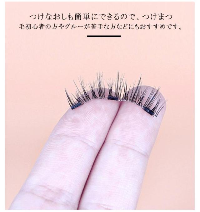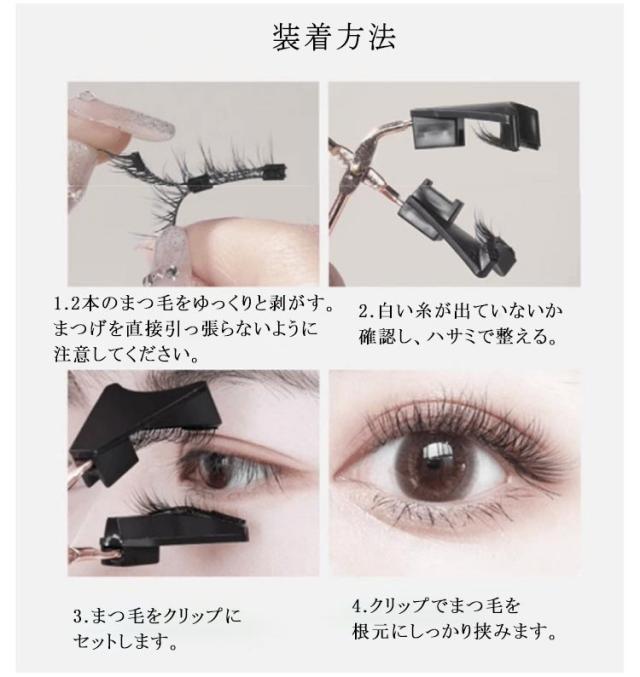 | 【4タイプ!】【マグネット式】【装着クリップ付き】 磁気まつげを自まつげのに置くだけで瞬時にくっつき、面倒な接着剤や接着剤は必要ありません。 磁石技術を採用し、高級人工繊維を使用し、接着剤なしで簡単にマグネットつけまつげを取り付けることができます。 ワンタッチするだけで、わずか3秒で美しく自然なまつげを実現できます。 まつげのボリュームアップさせながら、肌を傷めず、より重層的で立体的な目元を演出します。 つけなおしも簡単にできるので、つけまつ毛初心者の方やグルーが苦手な方などにもおすすめです。 装着方法 1.2本のまつ毛をゆっくりと剥がす。まつげを直接引っ張らないように注意してください。 2.白い糸が出ていないか確認し、ハサミで整える。 3.まつ毛をクリップにセットします。 4.クリップでまつ毛を根元にしっかり挟みます。 | |