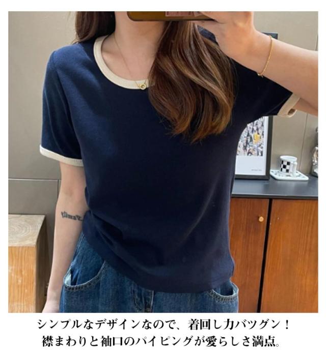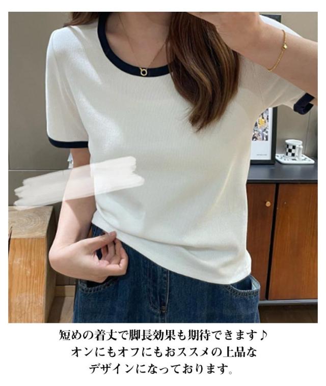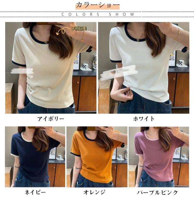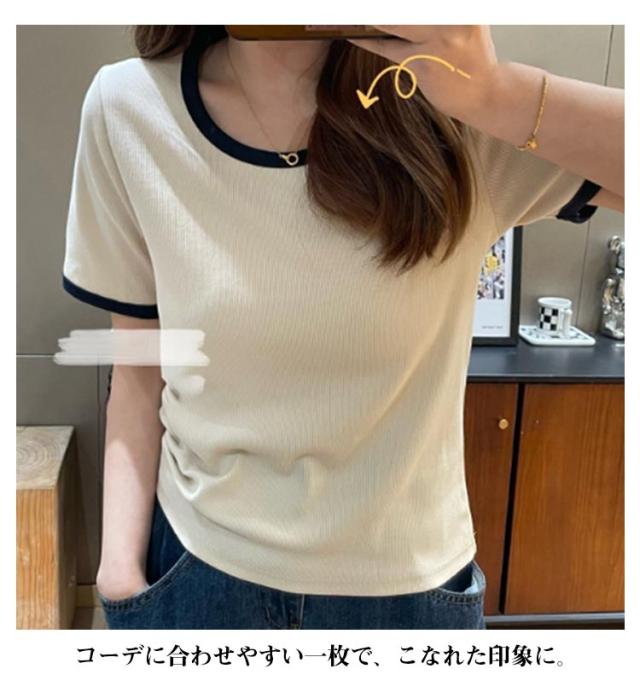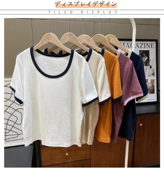 トップス Tシャツ バイカラー パイピング チュニック バイカラー プルオーバー クルーネック 半袖tシャツ ロングtシャツ 半袖カットソー カットソー 半袖 薄手 伸縮性 ストレッチ パイピング 配色 パイピング カジュアル ワンマイルウェア 普段使い 通勤