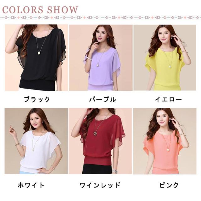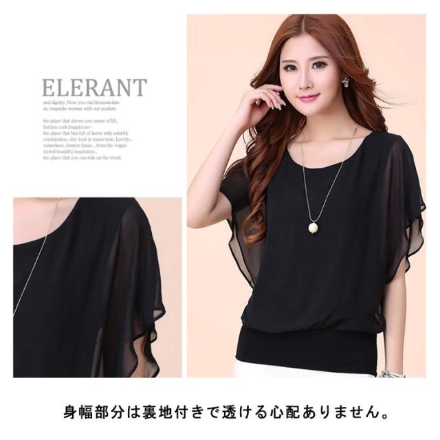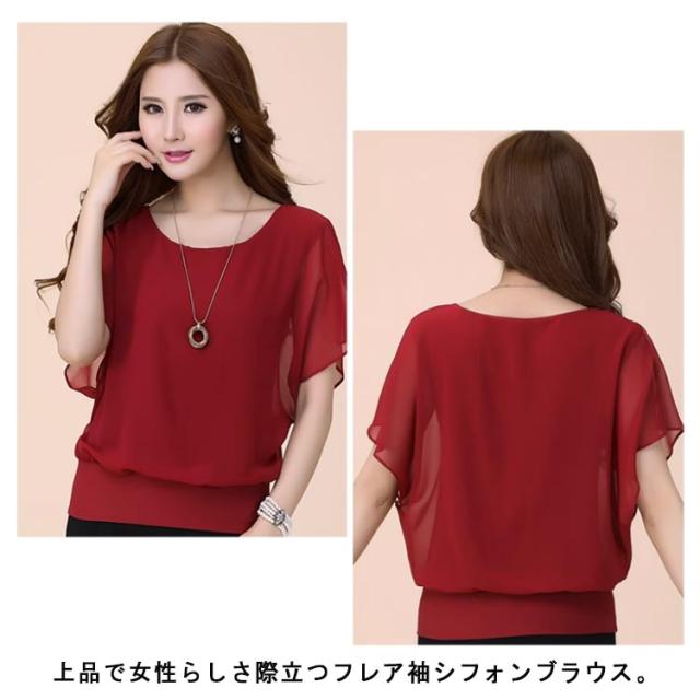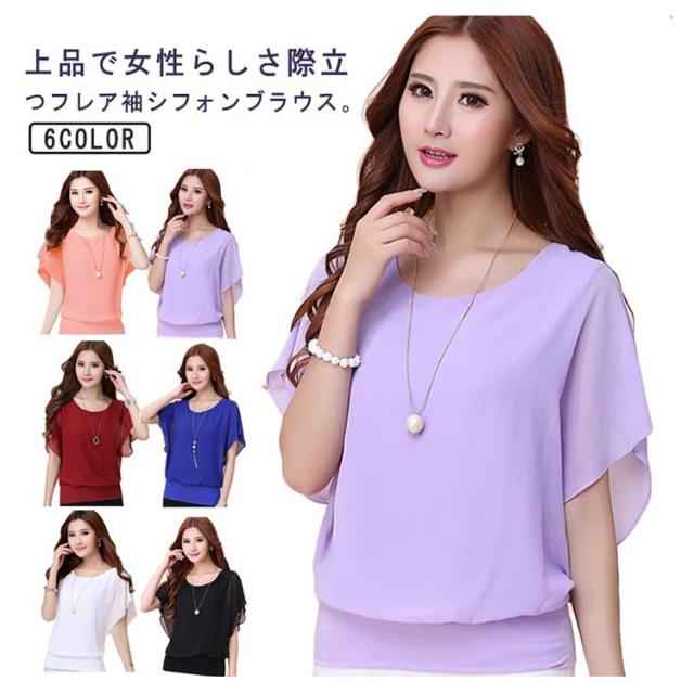 フレア袖 韓国ファッション シフォン半袖ブラウス トップス 夏 ブラウス シアー シフォンブラウス フリル シフォン半袖ブラウス 体型カバー レディース フリルスリーブ ラウンドネック オフィスカジュアル キレイめ おしゃれ
