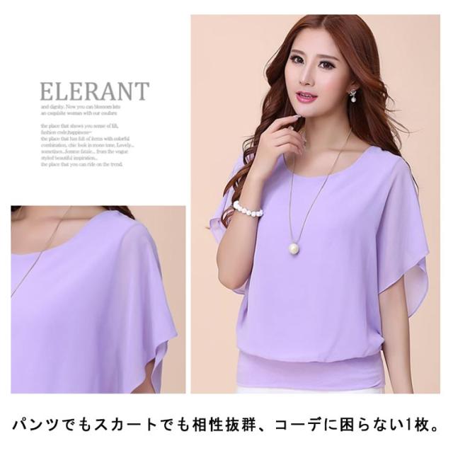 | 上品で女性らしさ際立つフレア袖シフォンブラウス。 透け感のあるフレア袖デザイン、二の腕を華奢魅せ、軽かな印象。 パンツでもスカートでも相性抜群、コーデに困らない1枚。 身幅部分は裏地付きで透ける心配ありません。 | |
