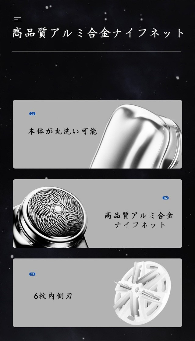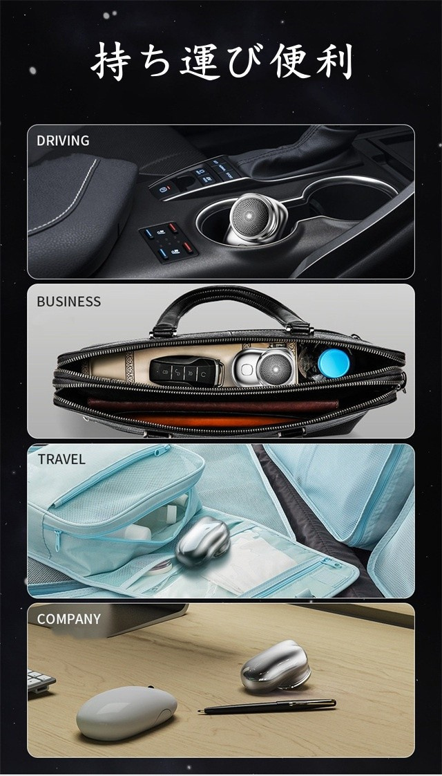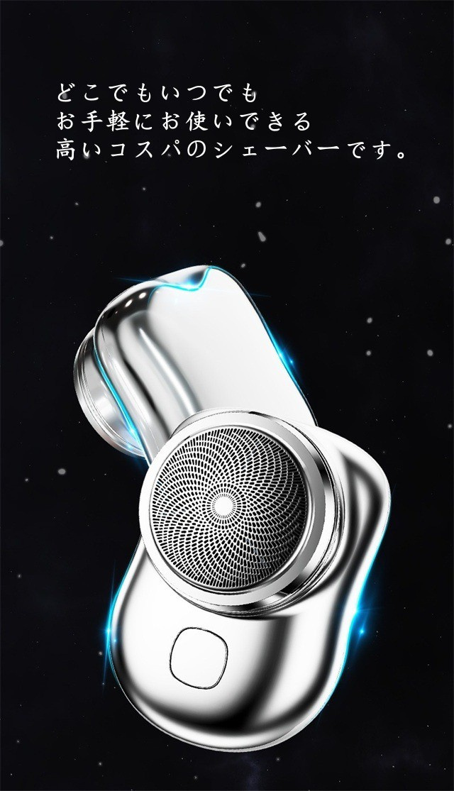 シェーバー本体は超軽量、超小型のデザインで、ポケットにも入るコンパクトサイズです。ビジネスバックやオフィス、さらに車内の収納スペースにも収納できます。オフィスに置けば、会議前でも緊急にシェービングでき;車内やバックに置けば、旅行先や出張先にもシェービングできます。まさにどこでもいつでもお手軽にお使いできる高いコスパのシェーバーます。