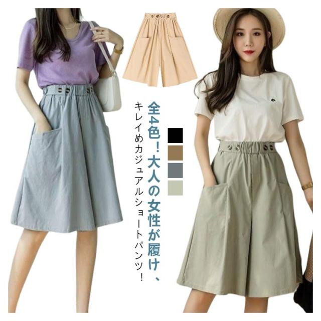 ガウチョパンツ Aライン ウエストゴム 薄手 膝丈 キュロットパンツ ゆったり ショートパンツ スカーチョ ハーフパンツ キュロットスカート お洒落 春夏 レディース ポケット付き カジュアル