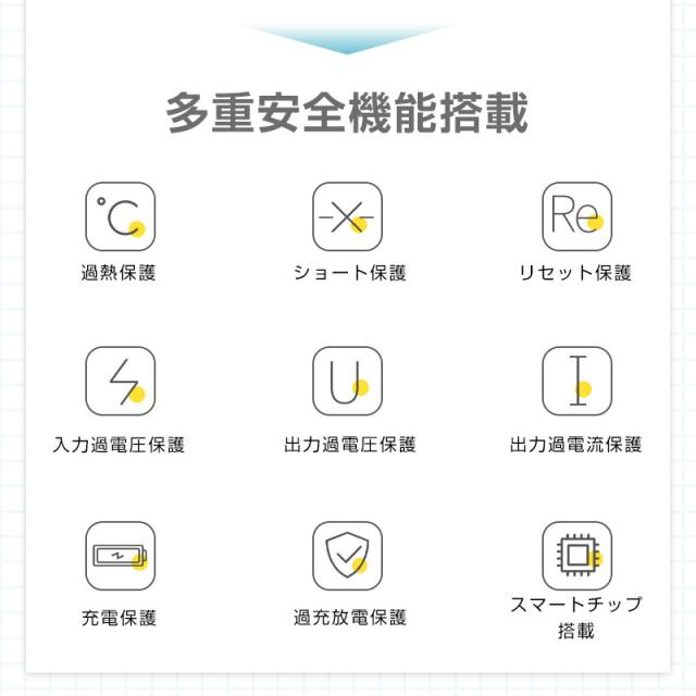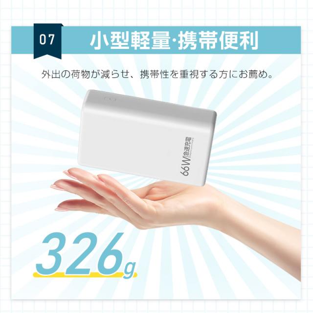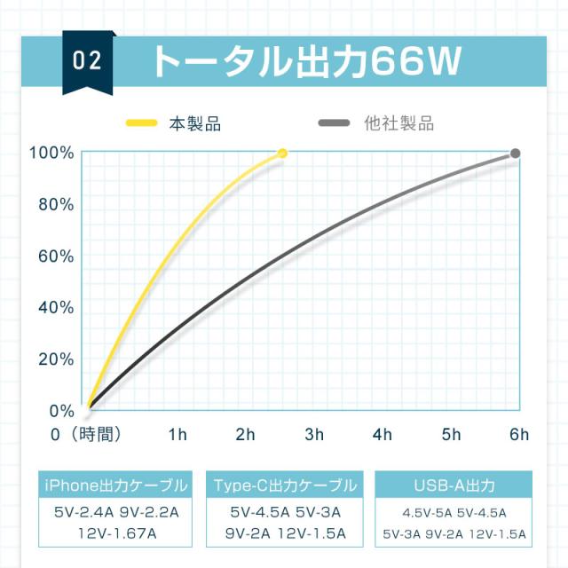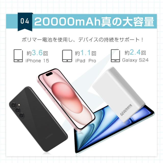 20000mAhの超大容量で、iPhone14を約4回、Galaxy S22を約3回、iPad mini 5を約2回満充電することができます。また、本製品の最大出力は5Aだから、スピーディーな充電が行えます。*出力電流が大きいほど、デバイスを充電する速度は速くなります。