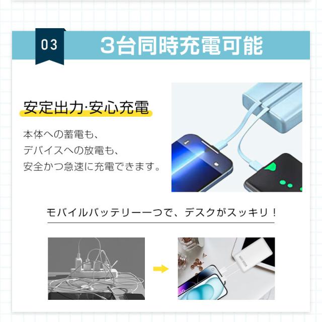 ケーブル内蔵型で、携帯性を重視する方におすすめ。外出する際の荷物が減らせるほか、自宅や訪問先にケーブルを置き忘れる心配がありません。必要なときに素早く引き出して充電できます。本体にはトランキングが設けており、ケーブルが絡まることがなく、スッキリと収まります。Type-C/iPhone出力ケーブル+1つのUSB-A出力ポートで3台の設備を同時に充電できます。