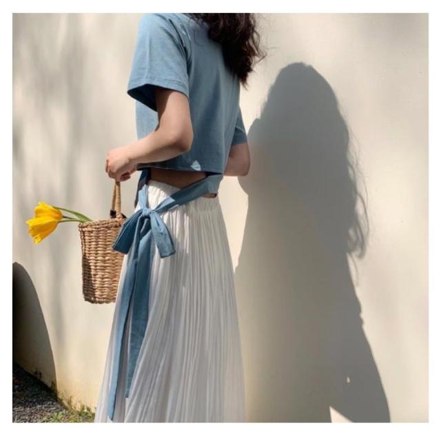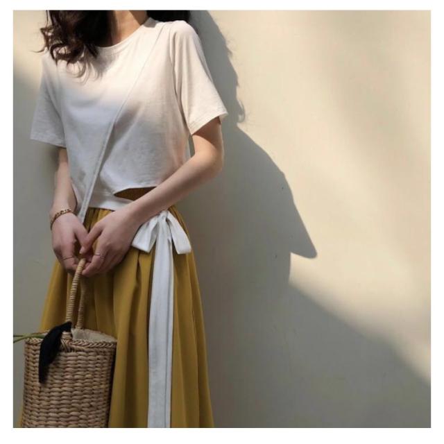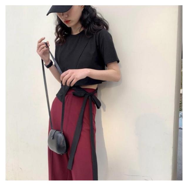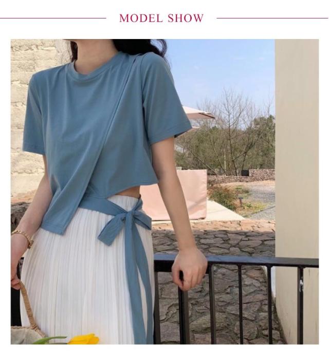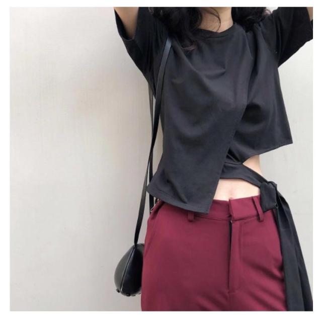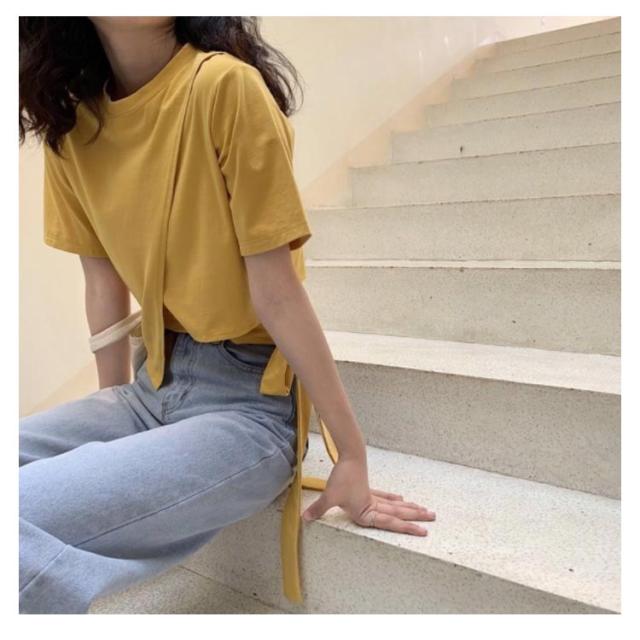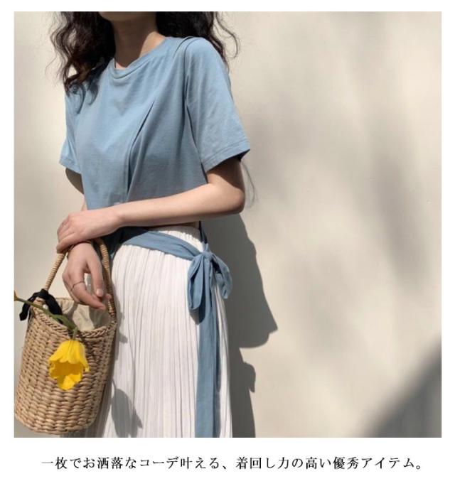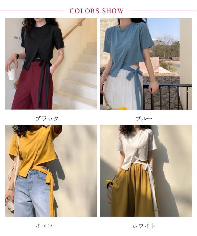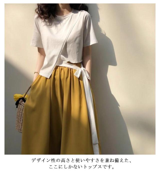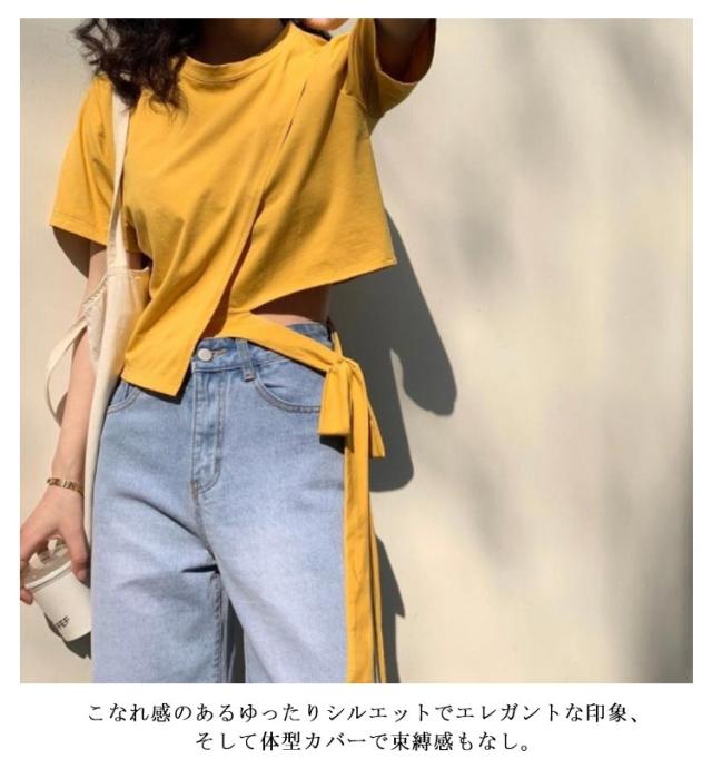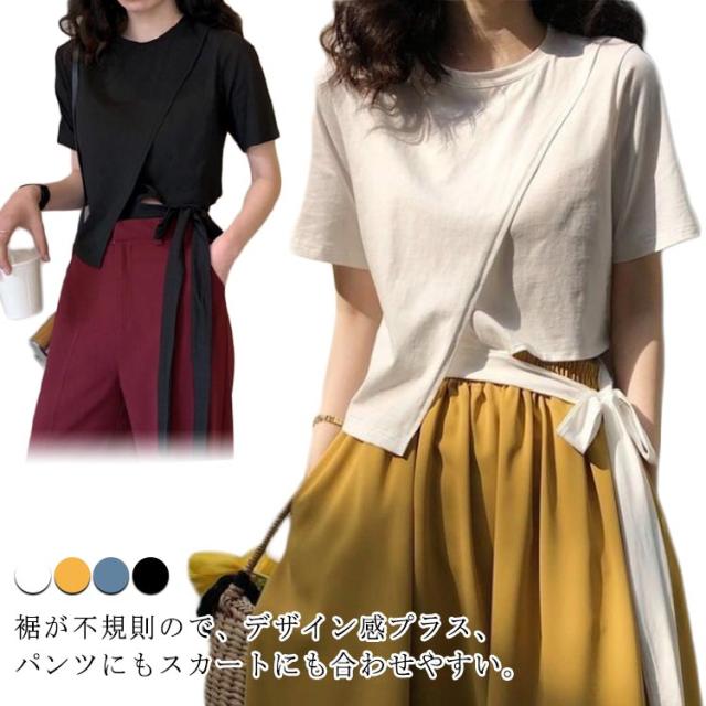 Tシャツ レディース アシンメトリー プルオーバー 無地 通勤 夏 カットソー 変形 春 半袖 デザイン スリット モード系 ラウンドネック 体型カバー トップス 個性的 春 夏 きれいめ カジュアル リボン