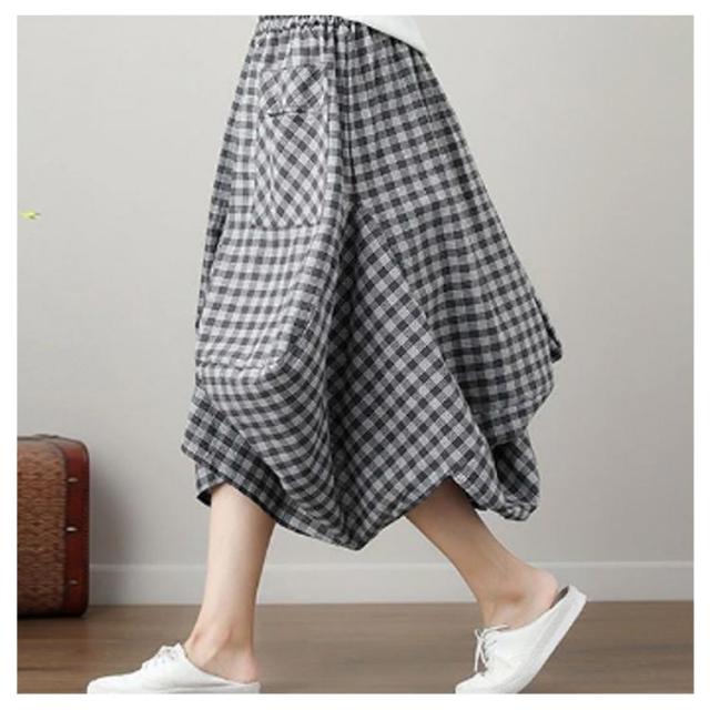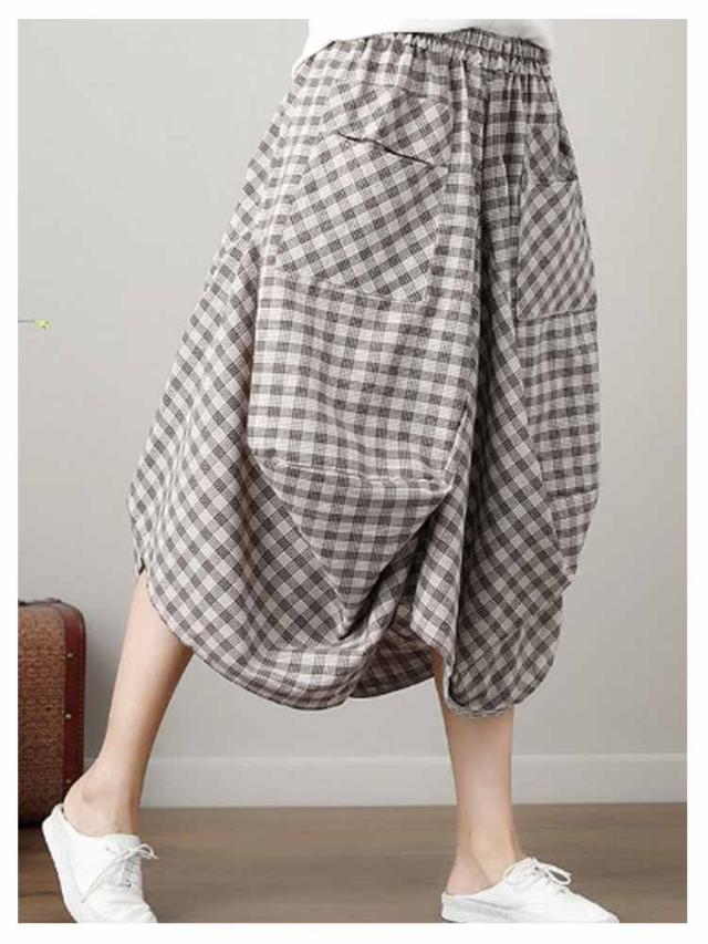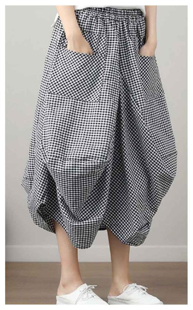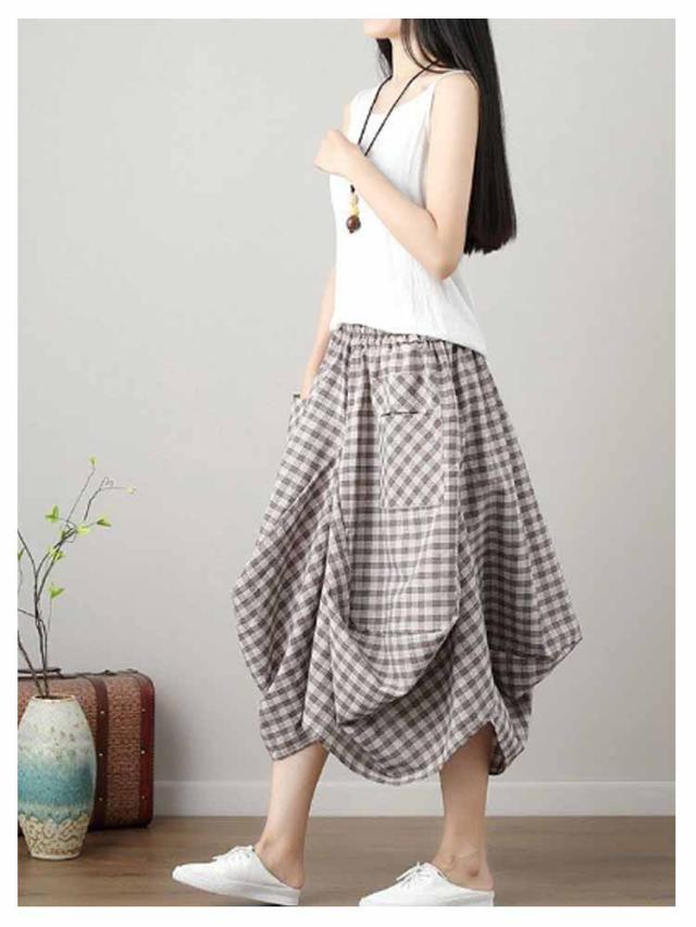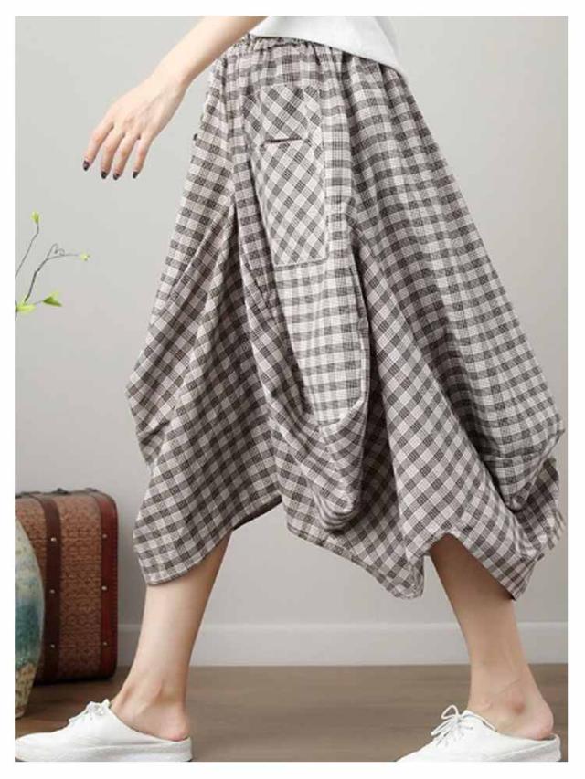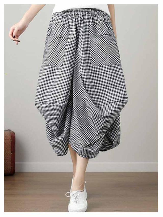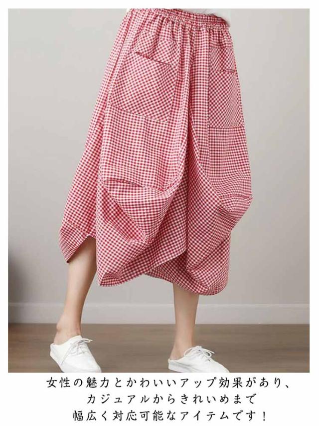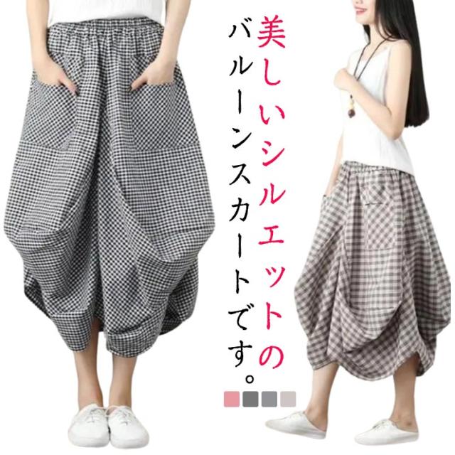 チェックスカート ロング バルーンスカート バルーンスカート ロング丈 アシンメトリー ロングスカート ミモレスカート チェック柄 スカート ハイウェスト Aライン ポケット 体型カバー
