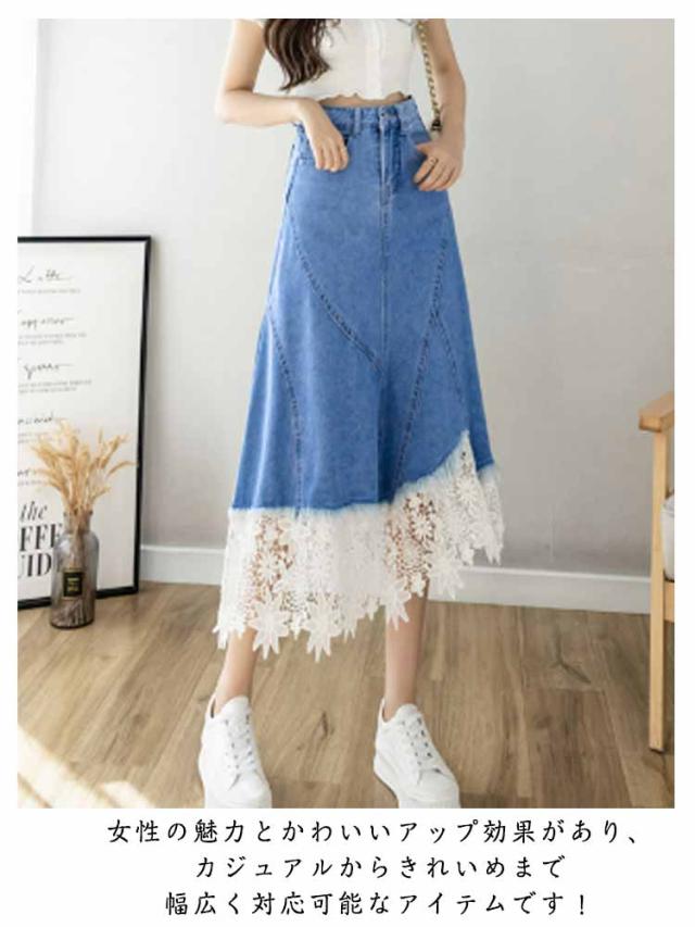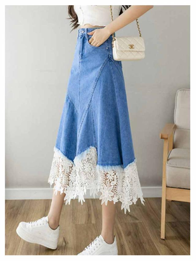 ハイウェスト スカート デニムスカート カジュアル Aラインスカート 美脚 切り替え レース切り替えスカート レース切り替え レース切り替え 花レース アシンメトリー 着痩せ 体型カバー フェミニン S M L XL