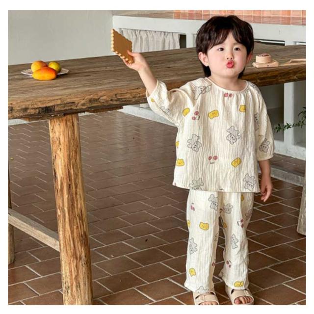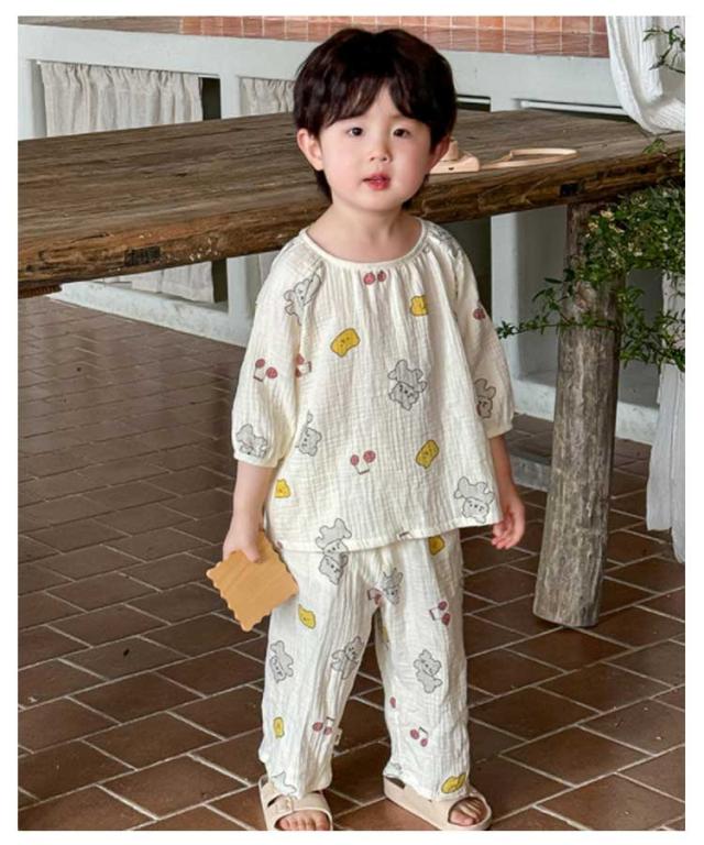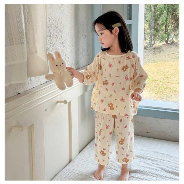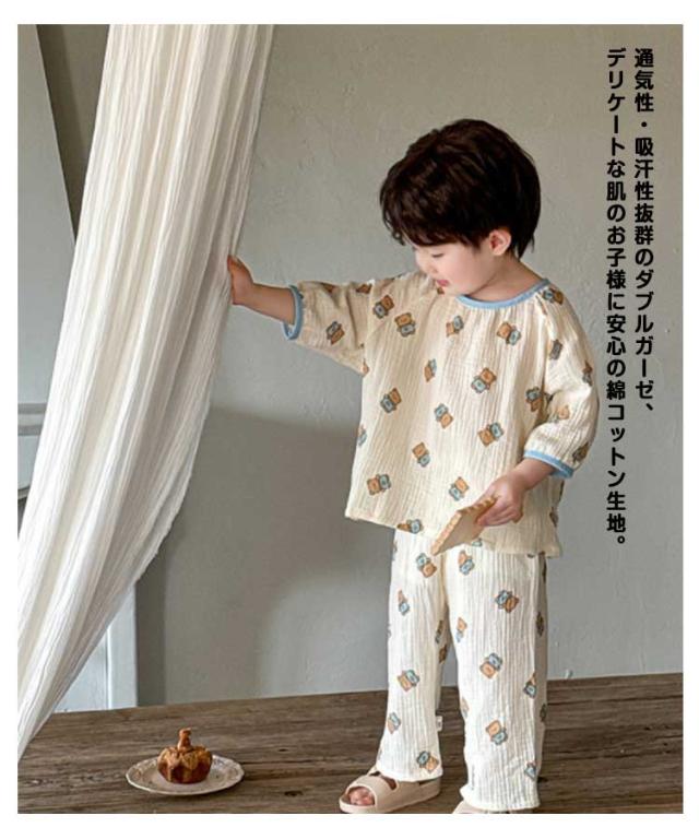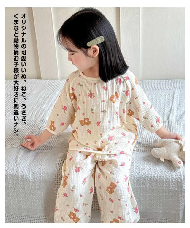 コットン キッズ パジャマ 春夏用 綿 ダブルガーゼ 上下セット 女の子 ルームウェア 長ズボン 冷房対策 部屋着 ナイトウェア かぶるだけ キッズ 男の子 小学生 ベビー用 室内着 保育園 幼稚園 犬 2重ガーゼ 猫 クマ