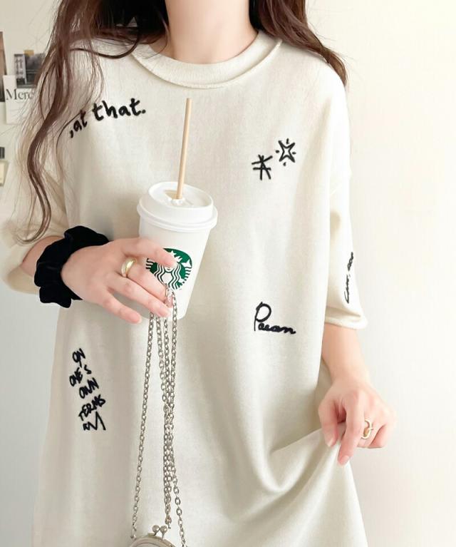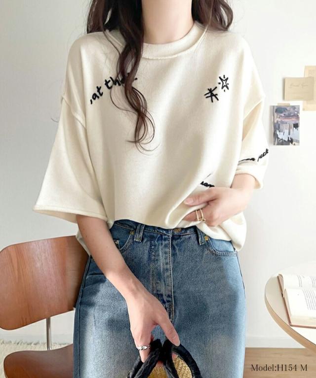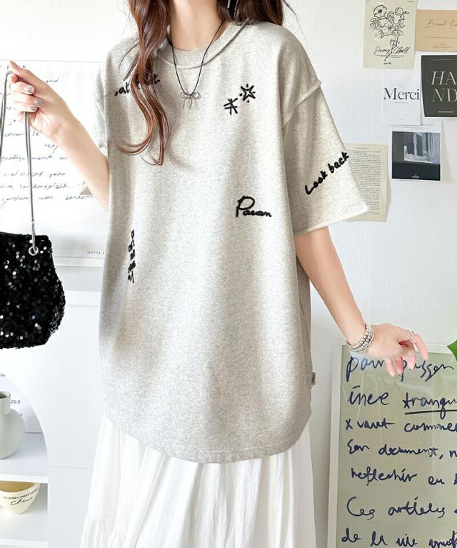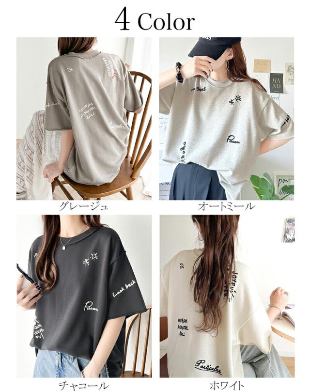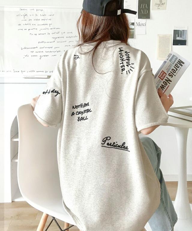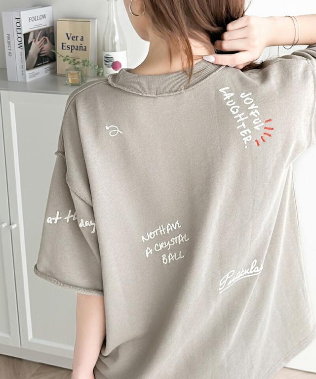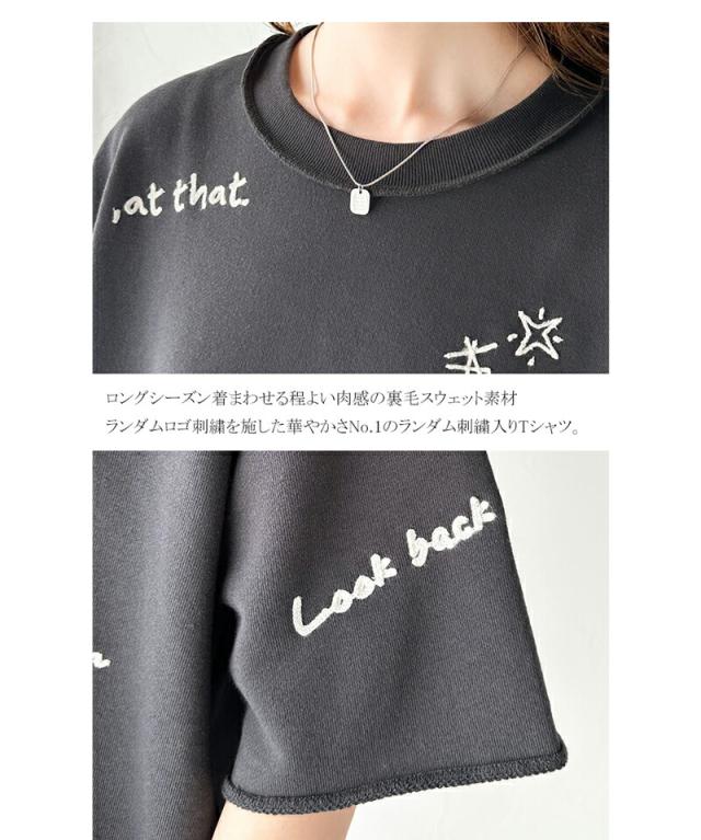 クラシカルエルフ冬新作 トップス Tシャツ レディース ランダム メッセージ ロゴ 刺繍 裏毛 ハーフ スリーブ Tee ゆるっと ビッグシルエット 袖 襟 くるん リブ 裾 ピスタグ ロングシーズン 大きいサイズ 2024ss ce1260260