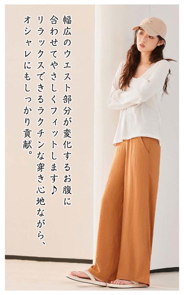 | 夏の人気アイテム!サラッと軽やかワイドパンツから、さらに涼やかに穿き心地の快適度をUPさせたマタニティパンツが登場! 肌離れが良いサラサラ感はそのままに、暑い季節に嬉しい接触冷感素材かつ、しっとり滑らかな肌触りで、一度穿いたら手放せなくなる素材感。 動きやすい抜群の伸縮性を持ち、シワを気にせず穿ける素材なので、忙しい毎日にサッと穿いて快適なオシャレを楽しめます。 Tシャツ&スニーカーを合わせたシンプルなカジュアルスタイルから、ブラウス&サンダルをコーディネイトしたちょっぴりキレイ目なスタイルまで! 幅広のウエスト部分が変化するお腹に合わせてやさしくフィットします♪リラックスできるラクチンな穿き心地ながら、オシャレにもしっかり貢献。 おうち時間のリラックスタイムや妊娠中はもちろん、産後や手術後などの楽ちんアイテムとして、お腹に負担をかけずにお使い頂けるアイテムです。 | |