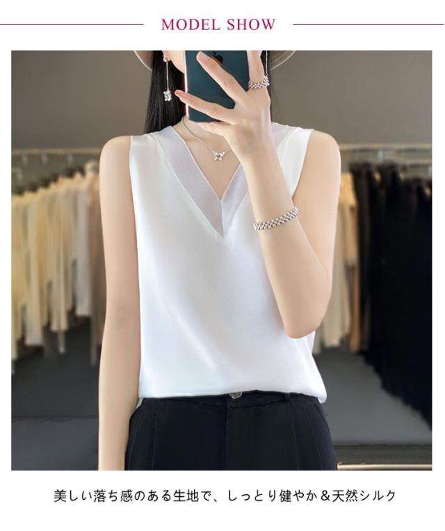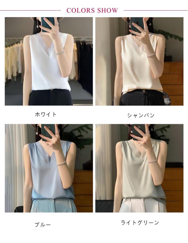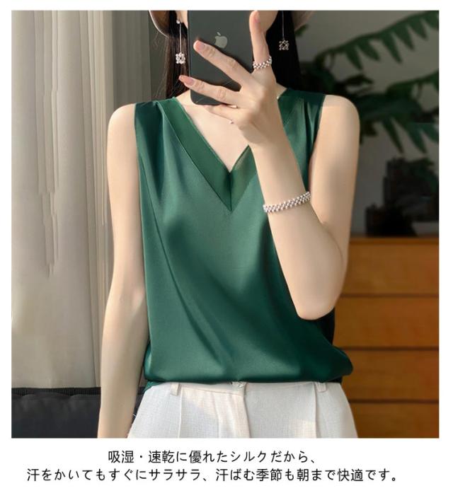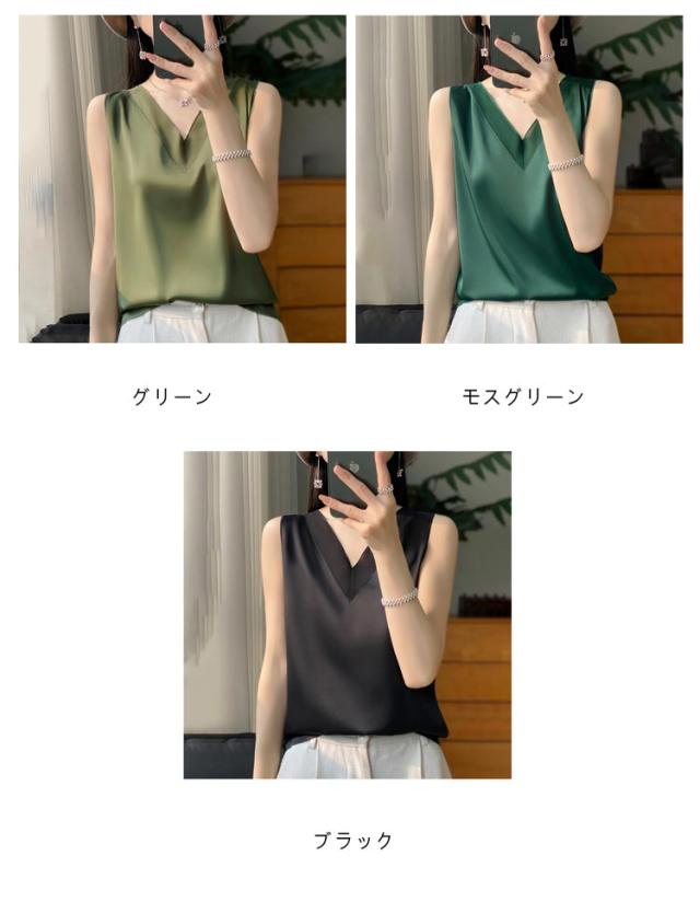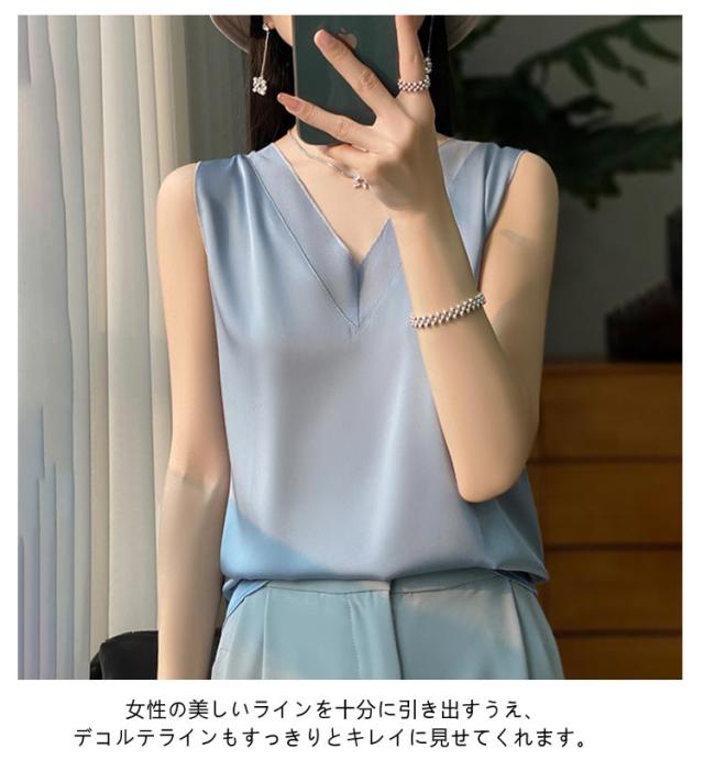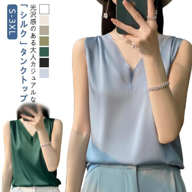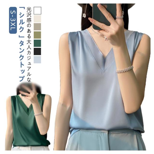 シルク サテン タンクトップ レディース キャミソール インナー レース vネック ゆったり 大きいサイズ トップス ノースリーブ ブラウス シャツブラウス シルクサテン ショート丈 ブラ紐隠し アンダーウェア 薄手 上品 光沢感 吸湿