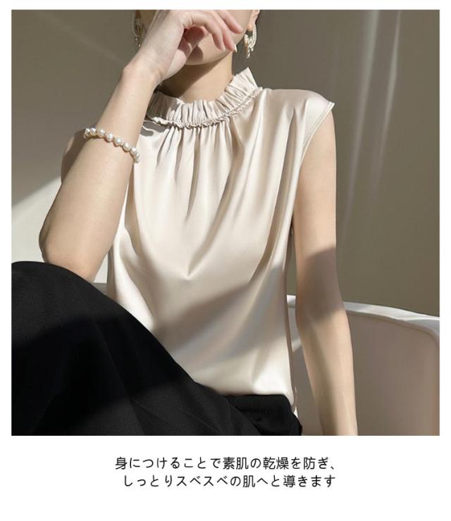 タンクトップ シルク サテン キャミソール レディース インナー 立ち襟 フリル プリーツ ブラウス シャツ ノースリーブ トップス 大きいサイズ ゆったり シャツブラウス 薄手 ショート丈 光沢感 高級感 上品 大人 重ね着 肌着 敏感肌