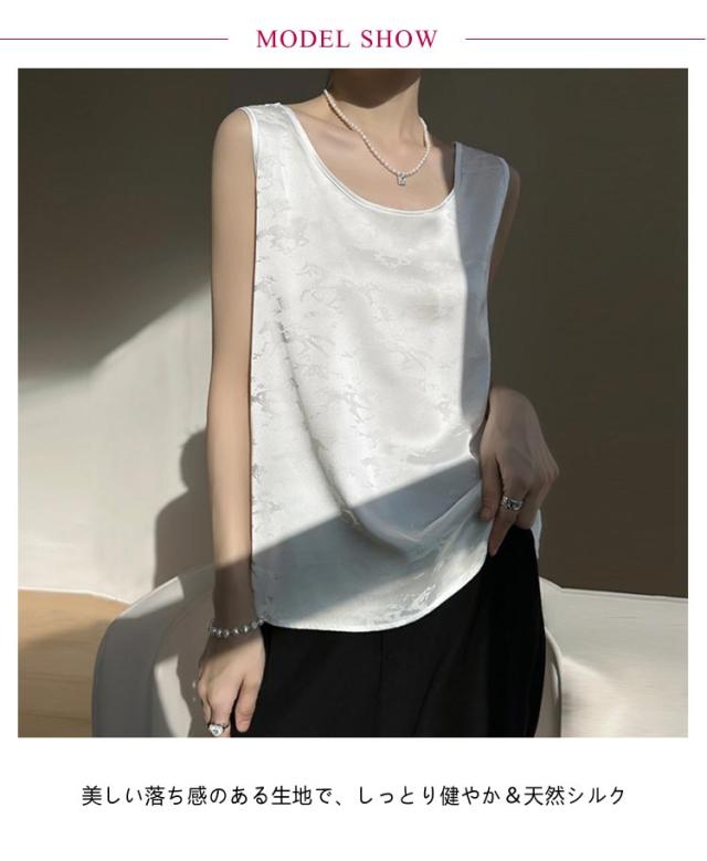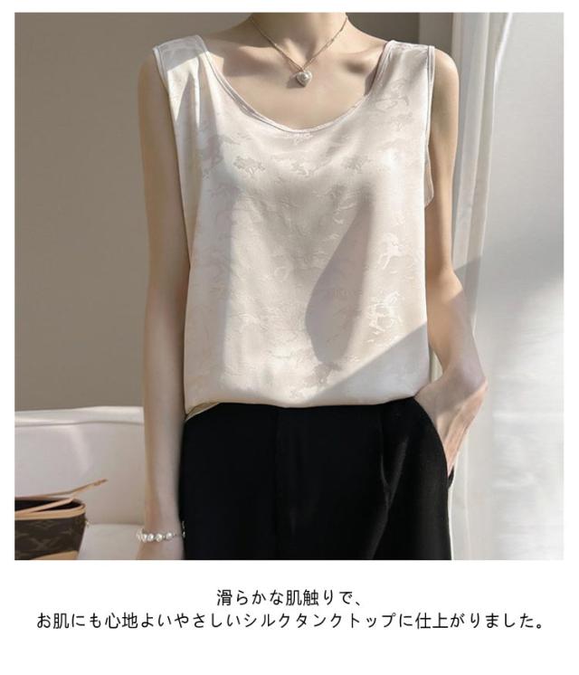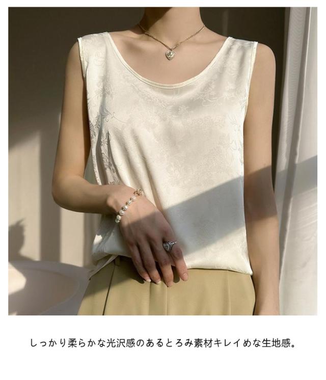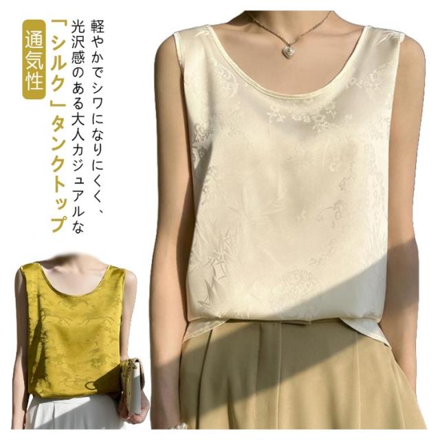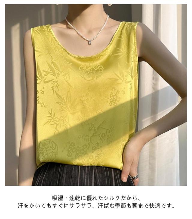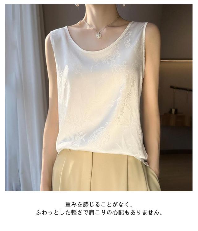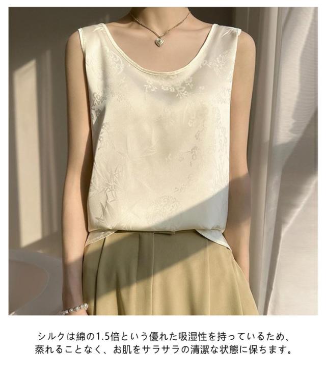 タンクトップ シルク サテン キャミソール レディース インナー Uネック プリント 刺? 柄 ブラウス シャツ ノースリーブ トップス 大きいサイズ ゆったり シャツブラウス 薄手 ショート丈 光沢感 高級感 上品 大人 重ね着 肌着 敏感肌