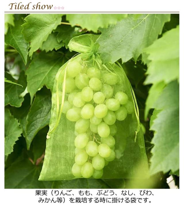 | 果実袋100枚入!果実の生育中に風雨や枝すれ、病虫害から果実を守り、きれいな果実を育てます。 果実(りんご、もも、ぶどう、なし、びわ、みかん等)を栽培する時に掛ける袋です。 入り口が巾着仕様になっており、きゅっと口が閉じられます 細かいメッシュ設計で、小さな虫の侵入を防ぎ、日光や通気性を妨げることなく果実の育成を促進します。 | |
