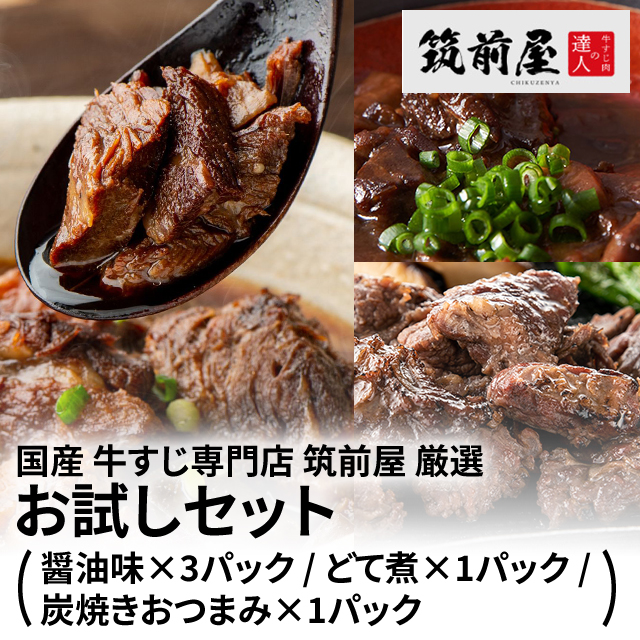 国産 牛すじ専門店 筑前屋 厳選 お試しセット ( 醤油味×3パック / どて煮×1パック / 炭焼きおつまみ×1パック ) レトルト 国産牛使用 常温保存 湯煎 肉 牛肉 牛スジ