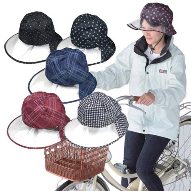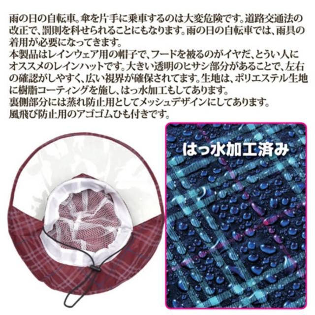 ●「改正道路交通法」が2015年6月1日から施行されることになりました●レインコートのフードがイヤな人にオススメ雨の日の自転車。傘を片手に乗車するのは大変危険です。道路交通法の改正で、罰則を科せられることにもなります。雨の日の自転車では、雨具の着用が必要になってきます。本製品はレインウェア用の帽子で、フードを被るのがイヤだ、とうい人にオススメのレインハットです。大きい透明のヒサシ部分があることで、左右の確認がしやすく、広い視界が確保されてます。生地は、ポリエステル生地に樹脂コーティングを施し、はっ水加工もしてあります。裏側部分には蒸れ防止用としてメッシュデザインにしてあります。風飛び防止用のアゴゴムひも付きです。