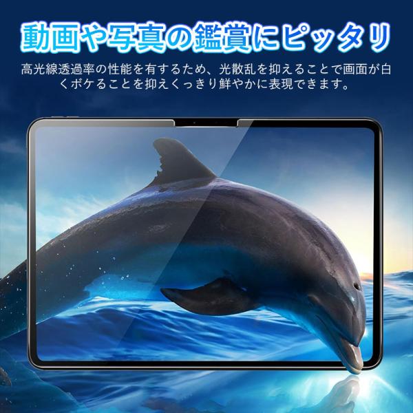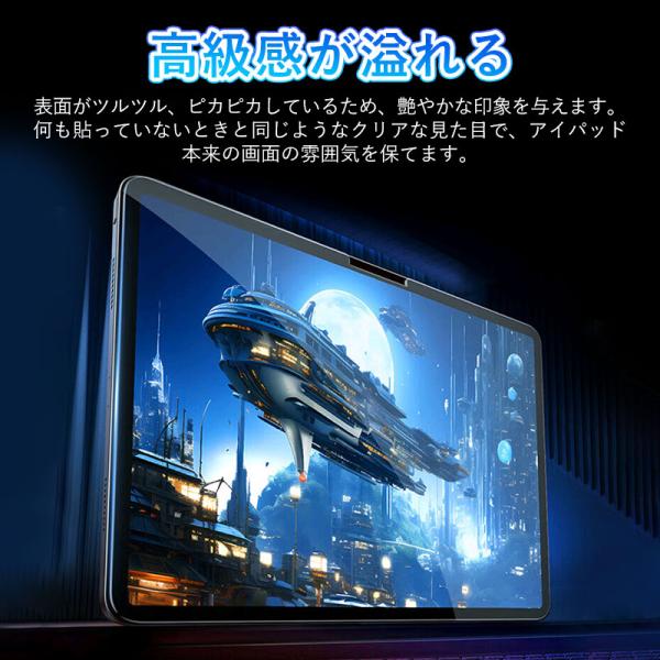 高光沢タイプは、画面がツルツルしており、透明度が高くて画質をよりきれいにうつし出してくれますので、鮮やかな画面をほぼそのまま再現するのに適したフィルムです。高光線透過率の性能を有するため、光散乱を抑えることで画面が白くボケることを抑えくっきり鮮やかに表現できます。表面はツルツルピカピカし、アイパッド本来の画面の雰囲気を保つことができて、高級感が溢れます。