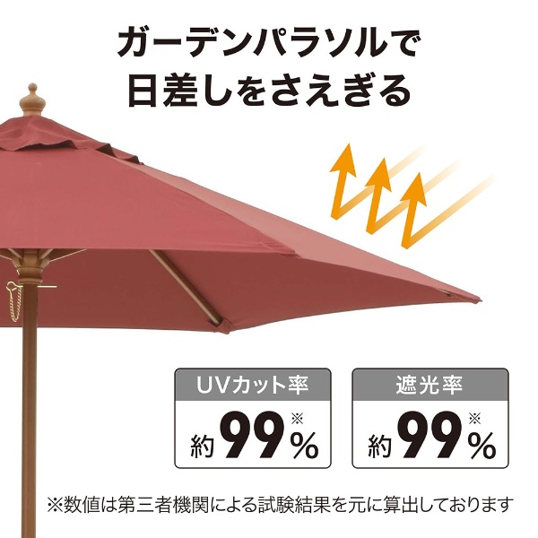 ウッドパラソル 2.1m エンジ 紫外線カット率:約99%!リーズナブルな価格で人気のスタンダードタイプ。日差しを遮り、心地よい日陰を生み出します ■サイズ:直径2.1m ■カラー:エンジ ■型番:PAL-21E ■構造:組立品 ■材質:本体:天然木、生地:ポリエステル ■サイズ:約直径210cm×高さ223cm ■重量:約4kg ■備考:●支柱:約直径3.5cm●親骨:約105.4cm●UVカット率:約99%●遮光率:約99% ※お客様組立て品につきましては、組み立て後に不良の連絡をされても対応ができません。 組み立て前にパーツに不良・傷等がないか、必ずご確認下さいますようよろしくお願い申し上げます。 ※記載は商品仕様の一部です。仕様説明不足等の理由での返品はできません。特に適合等は必ずご確認ください。