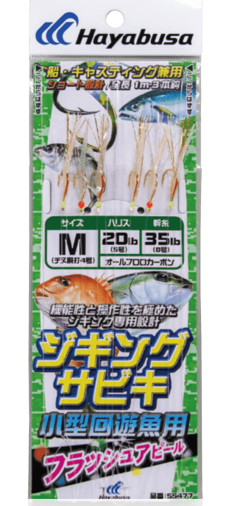 ジギングシーンで安定した釣果を約束する「ジギングサビキ」のフラッシュアピールタイプ。「サビキのハヤブサ」独自の経験から導き出された、フラッシング効果の高いホログラムシールとブライトン、鈎自身もフラッシングする胴打鈎を組み合わせました。