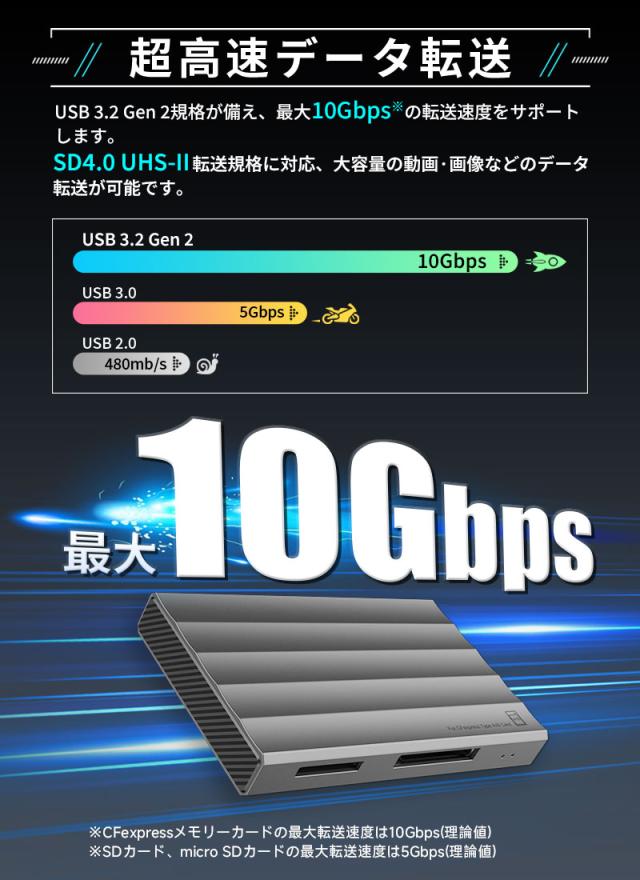 USB 3.2 Gen 2規格が備え、最大10Gbps(理論値)の転送速度により、大容量の動画?画像などのデータ転送が可能です。USB Type-Cポート搭載の機器同士で直接に利用できるため、データ転送やファイル管理に最適、動画・写真等も簡単に共有できます。