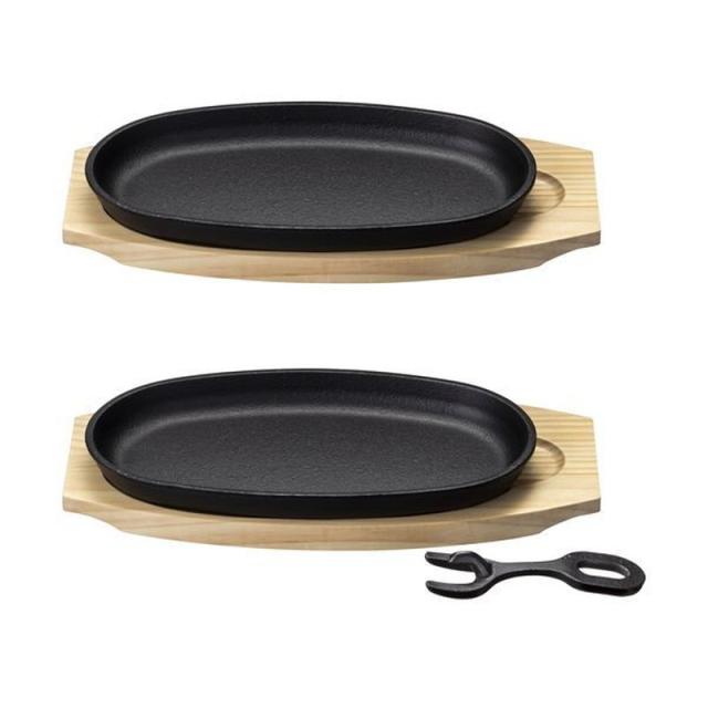 ステーキ皿 鉄板 小判型 23.5x14cm ガス火 IH対応 鉄鋳物 小判ステーキ皿 2枚組 敷板・ハンドル付