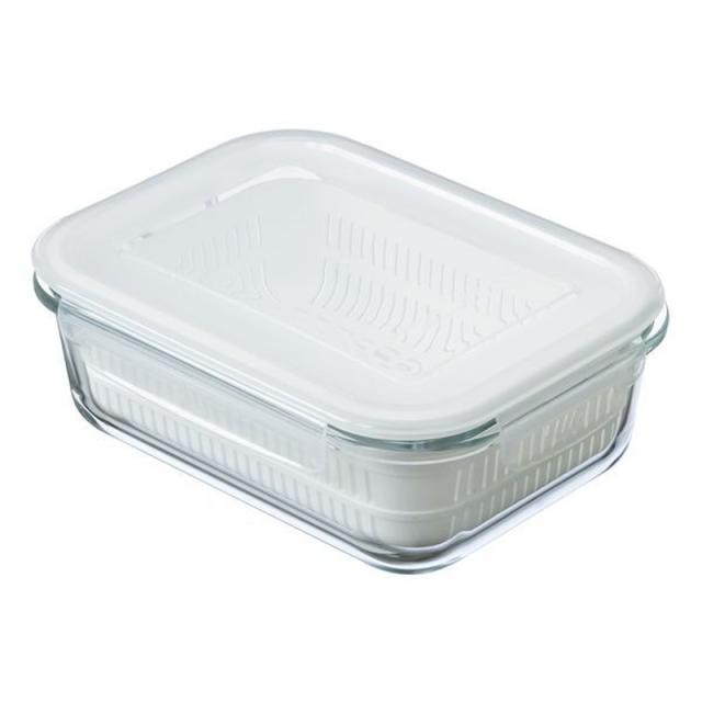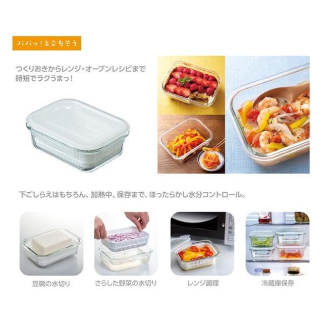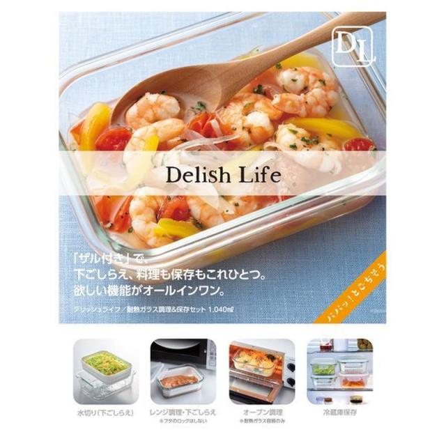耐熱ガラス保存容器 4面ロック密封蓋 ザル付き デリッシュ・ライフ 耐熱ガラス調理&保存セット 1040ml