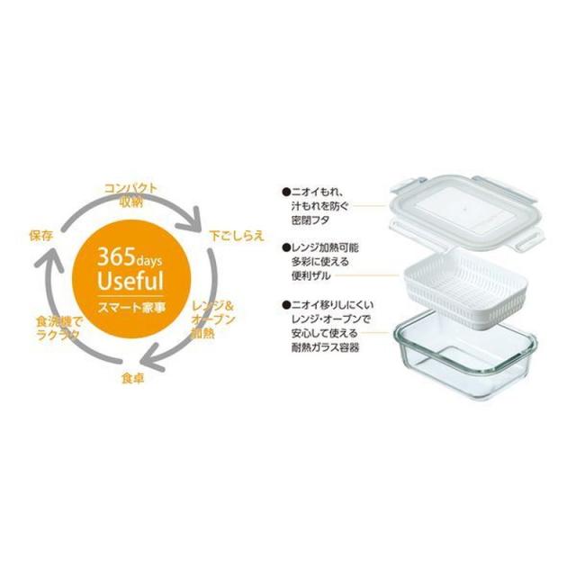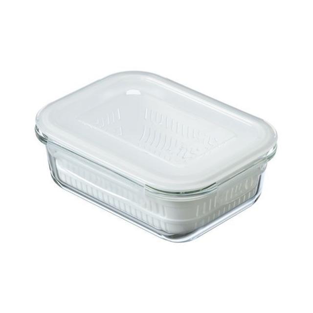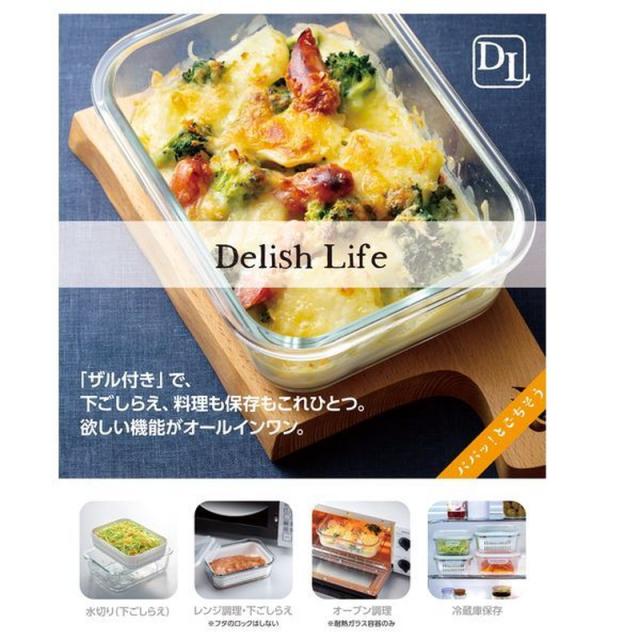 耐熱ガラス保存容器 4面ロック密封蓋 ザル付き デリッシュ・ライフ 耐熱ガラス調理&保存セット 650ml