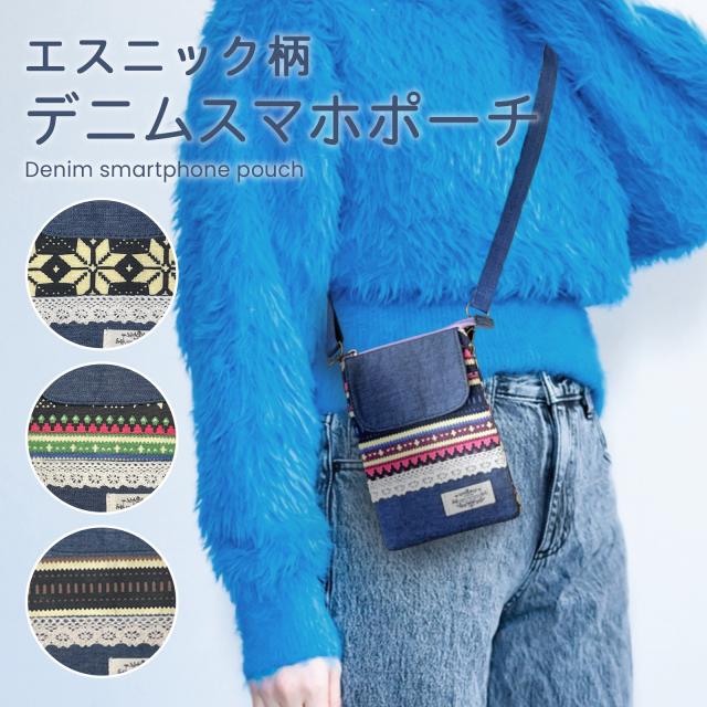 ★ 送料無料 ★ エスニック柄 デニム スマホポーチ スマホショルダー 大き目サイズ 肩掛け ショルダーバッグ 斜め掛け ショルダーベルト かわいい