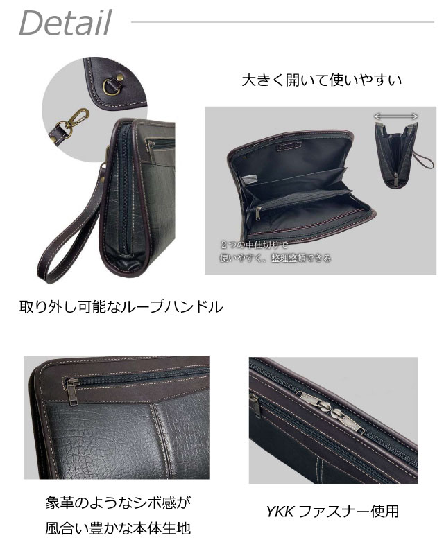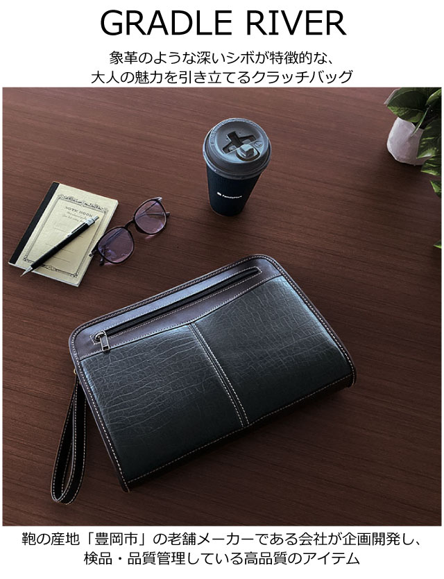 ![]() ![]() ![]() ![]() ![]() ![]() ![]() CRADLE RIVER クレイドルリバー 象革のような深いシボが特徴的な、大人の魅力を引き立てるセカンドバッグ。 ちょっとした外出から旅行先でのサブバッグ、フォーマル、ビジネスなど幅広く使えるデザイン。B5サイズが入り、開口部が大きく開いて出し入れしやすく、必要なものがしっかり収納できます。 鞄の産地「豊岡市」の老舗メーカーである当社が企画開発し、検品・品質管理している高品質のアイテムです。プレゼントにもおすすめです。