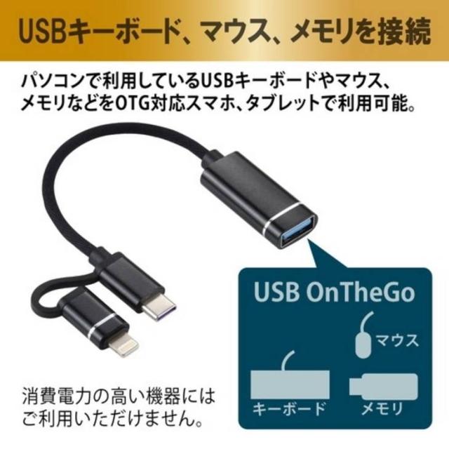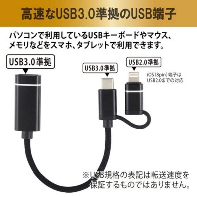 ■USBキーボードやマウス、メモリを接続OTG機能を搭載したスマートフォンやタブレットで、USBキーボードやマウス、メモリを接続できます。使いなれたキーボードで文章作成やパソコンで作成した資料をUSBメモリ経由でタブレットに移動することも簡単です。■OTG対応のAndroid(Type-C) & iPhone/iPad(8pin)に対応OTG対応Android(Type-C搭載)のスマートフォンやタブレットの他、 iOS/iPadOS13以上に対応したiPhone/iPadでご利用いただけます。■高速なUSB3.0準拠USB3.0対応したUSBメモリとスマートフォン、タブレットとのデータ転送が高速に行うことができ大容量のデータもスムーズに受け渡しすることが可能となります。※iOSコネクタはUSB2.0準拠となります。