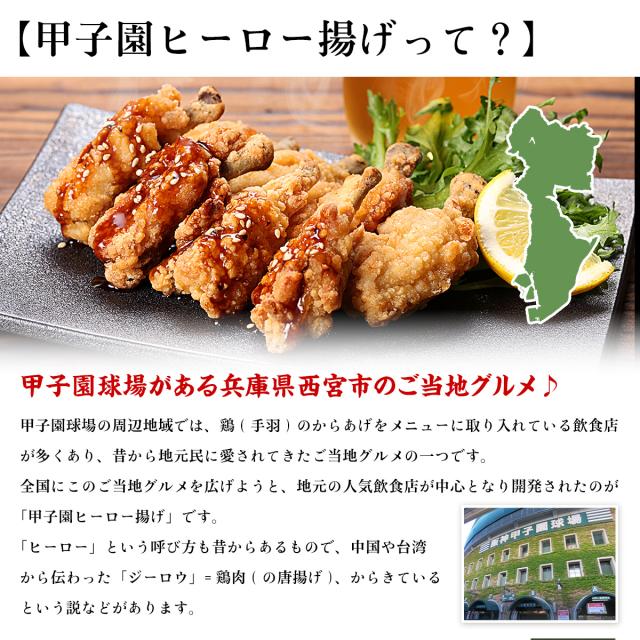 かつて甲子園では、鶏(手羽)のからあげをメニューに取り入れている飲食店が多くありました。「ヒーロー」という呼び方も昔からあるもので、中国や台湾から伝わった「ジーロウ」=鶏肉(の唐揚げ)、からきているという説などがあります。 そんな「甲子園ヒーロー揚げ」は大人から子供まで、誰もがヤミツキになる、あとをひく旨さの特性のニンニクダレとサクサクの衣が特徴です。 骨を持って片手で食べられる上に、トースターで焼くだけの簡単調理である為、日々の食卓の一品やお弁当にもピッタリな一品です。
