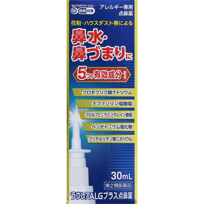 ラウレアALGプラス点鼻薬は抗アレルギー剤クロモグリク酸ナトリウムを配合したアレルギー専用点鼻薬です。クロモグリク酸ナトリウムがアレルギーの原因となるヒスタミン等の化学伝達物質の放出を抑え、アレルギー症状の発生を防ぐはたらきがあります。またナファゾリン塩酸塩が鼻粘膜のはれや充血を抑え鼻づまりを緩和し、クロルフェニラミンマレイン酸塩が抗ヒスタミン作用によりすでに起こってしまったくしゃみ、鼻水を鎮めます。花粉やハウスダスト等による鼻水、鼻づまり、くしゃみなどの不快な症状に効果を発揮します。