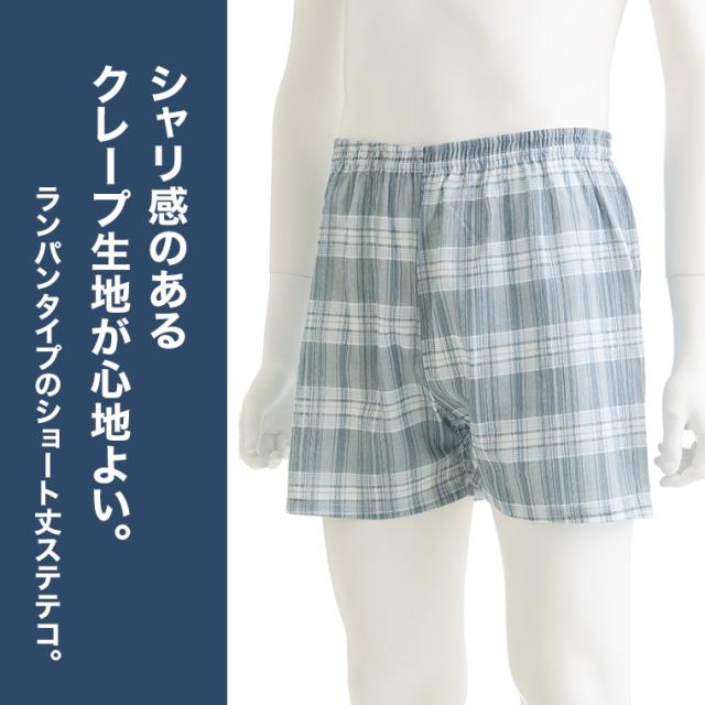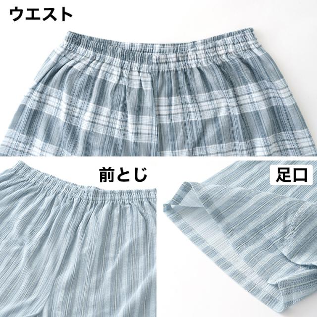 クレープ肌着 紳士 ピケ プリントランパン 2柄2枚 セット メンズ 春夏 綿 100% 下着 インナー 夏用 前閉じ ステテコ ショート丈 パンツ 男性 抗菌 防臭 24SS 格子柄/ストライプ柄 L0257E-R