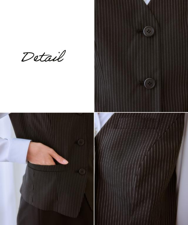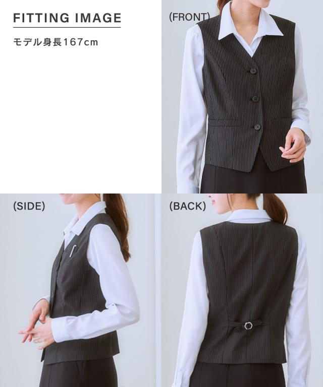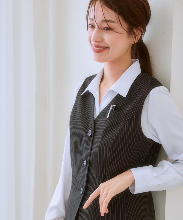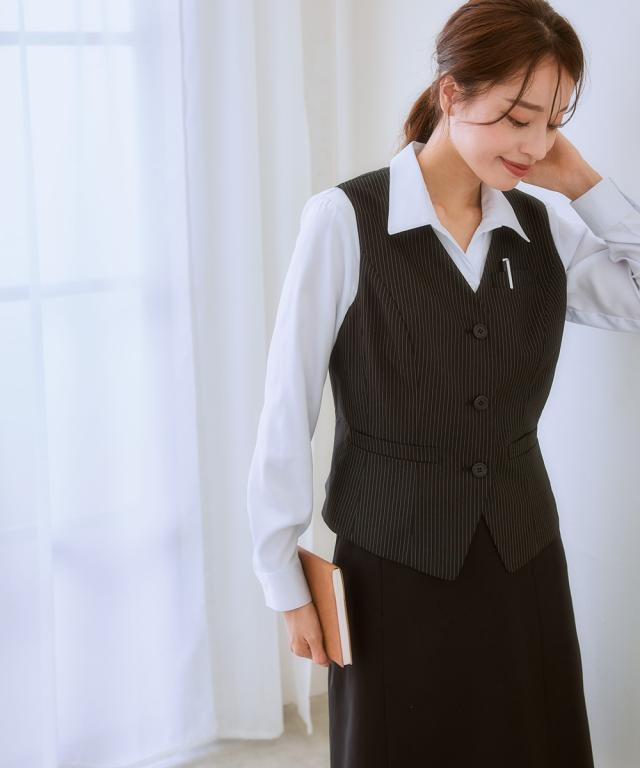 ◆自分で好きなデザイン組み合わせとサイズが選べる制服シリーズ!清楚なストライプ柄です☆◆・身体の厚みに自然にフィットし、すっきりとしたシルエットを作り出す五面体を採用したベストです。・制服として必要なポケットは胸と両サイドに。更に右前ポケットには小さな印鑑等を収納できる小分け仕切りが付きました。・毎日着用するものだから。。。洗濯機で洗えて清潔! お家で洗えて経済的♪ポリエステル素材なので乾きも早くオフィスレディを応援します。・人と接することも多いので。。。抗菌消臭テープ付なのでデオドラント対策も◎