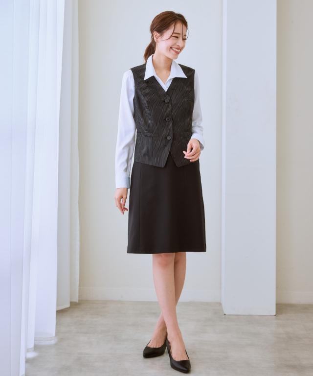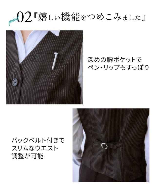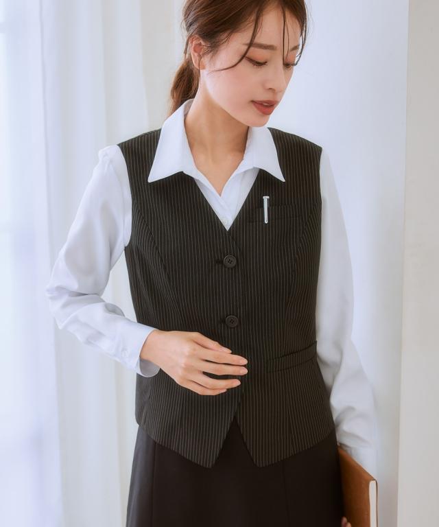 ◆自分で好きなデザイン組み合わせとサイズが選べる制服シリーズ!清楚なストライプ柄です☆◆・身体の厚みに自然にフィットし、すっきりとしたシルエットを作り出す五面体を採用したベストです。・制服として必要なポケットは胸と両サイドに。更に右前ポケットには小さな印鑑等を収納できる小分け仕切りが付きました。・毎日着用するものだから。。。洗濯機で洗えて清潔! お家で洗えて経済的♪ポリエステル素材なので乾きも早くオフィスレディを応援します。・人と接することも多いので。。。抗菌消臭テープ付なのでデオドラント対策も◎